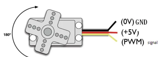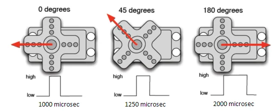 Угол поворота сервопривода контролируется путем регулирования скважности PWM (широтно-импульсной модуляции) сигнала. Стандартный цикл PWM сигнала – 20 мс (50 Гц). Теоретически ширина распределяется между 1 мс и 2 мс, но на практике она находится в диапазоне от 0,5 мс до 2,5 мс. Ширина соответствует углу поворота от 0° до 180°. Однако у разных брендов моторов один и тот же сигнал может иметь разные углы поворота.