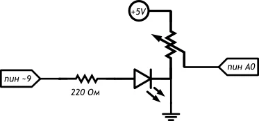 Мы подключили «землю» светодиода и переменного резистора (потенциометра) к длинной рельсе «-» макетной платы, и уже ее соединили с входом GND микроконтроллера. Таким образом мы использовали меньше входов и от макетки к контроллеру тянется меньше проводов.