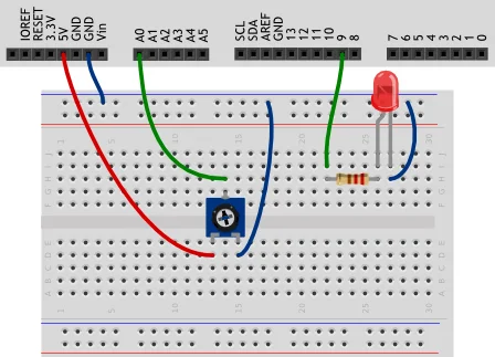 В этом эксперименте мы меняем яркость светодиода, вращая ручку переменного резистора.
