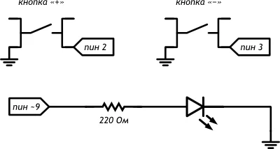 В этом эксперименте мы добавляем порцию яркости светодиоду одной кнопкой и убавляем другой.