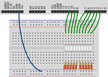 В этом эксперименте мы заставляем огонёк бежать по светодиодной шкале.