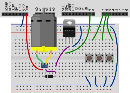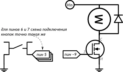 INPUT_PULLUP. На цифровых портах Arduino есть встроенные подтягивающие резисторы, которые можно включить указанным образом одновременно с настройкой порта на вход. Именно поэтому мы не использовали резисторы при сборке схемы.На каждой итерации цикла мы задаем мотору скорость вращения, пропорциональную текущему значению счетчика. Но выполнение инструкций не дойдет до назначения новой скорости, если при проверке нажатия кнопки она окажется отпущенной. Инструкция
