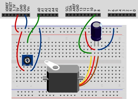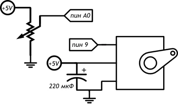 В этом эксперименте мы вращаем сервопривод на угол, задаваемый потенциометром.