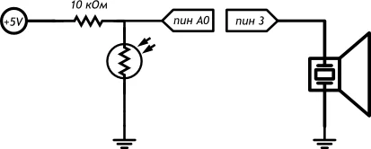 Измените код программы так, чтобы с падением освещенности звук становился ниже (например, падал от 5 кГц до 2,5 кГц)
