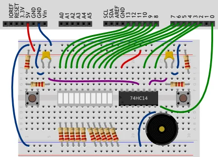 74HC14, которая называется инвертирующий триггер Шмитта, нужна для аппаратного подавления дребезга. Посмотрите видеоурок на эту тему.В этом эксперименте нам нужно очень много цифровых портов, поэтому нам пришлось использовать порт 0. Пользоваться им неудобно из-за того, что он соединен с одним из каналов последовательного порта, поэтому перед прошивкой микроконтроллера нам придется отключать провод, идущий к пьезопищалке, а после прошивки подключать его обратно.