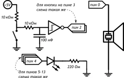 Схема подключения кнопок с использованием конденсаторов, резисторов и микросхемы