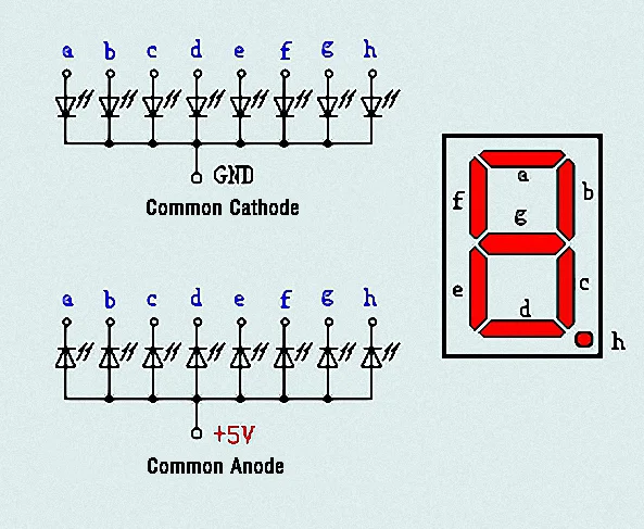 Общий анод (CA): общий вывод → +5 V, LOW → сегмент светится.