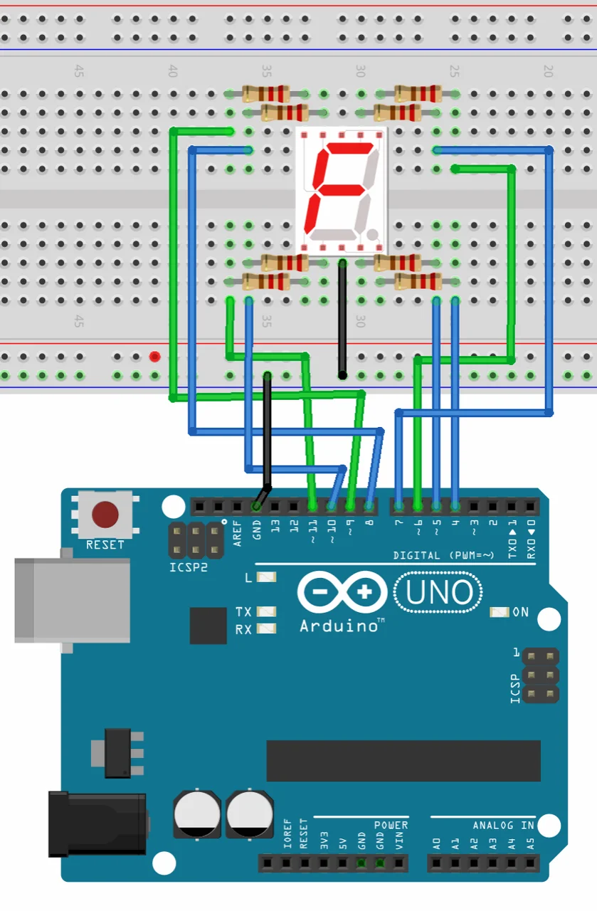В уроке используется общий катод: COM → GND, каждый сегмент через резистор к отдельному пину Arduino.