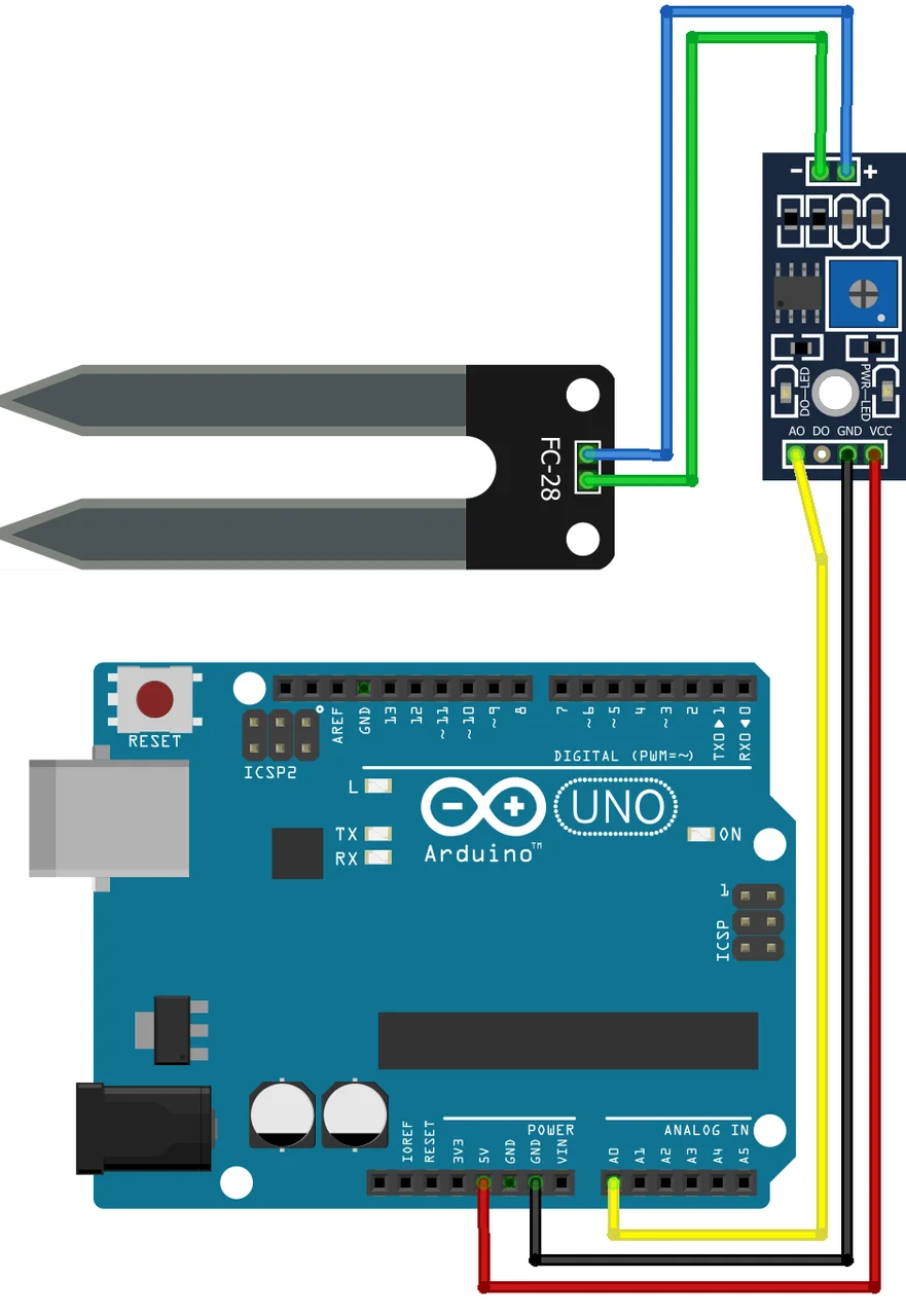 Датчик влажности почвы FC-28 — простой и доступный модуль для автоматизации полива растений. Он определяет уровень влажности почвы с помощью двух зондов и электронного модуля на компараторе LM393. Датчик может работать с аналоговым и цифровым выходом, что позволяет использовать его в различных проектах Arduino для контроля и автоматизации полива.