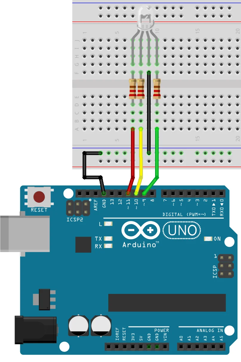 G-канал → через резистор → 9 (PWM)