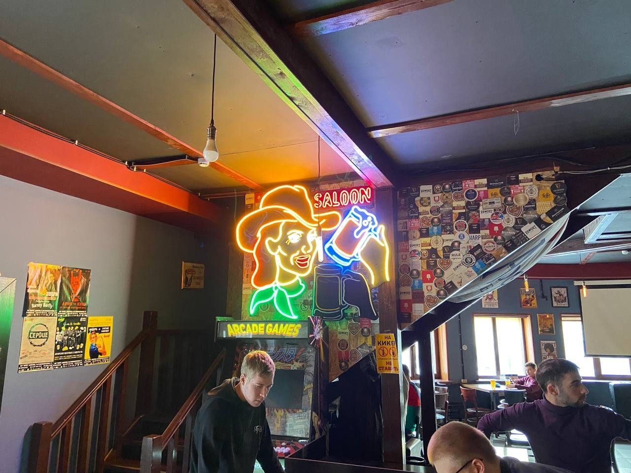 Глаз ковбойши открыт, кружка опущена, надпись «Saloon» не горит.