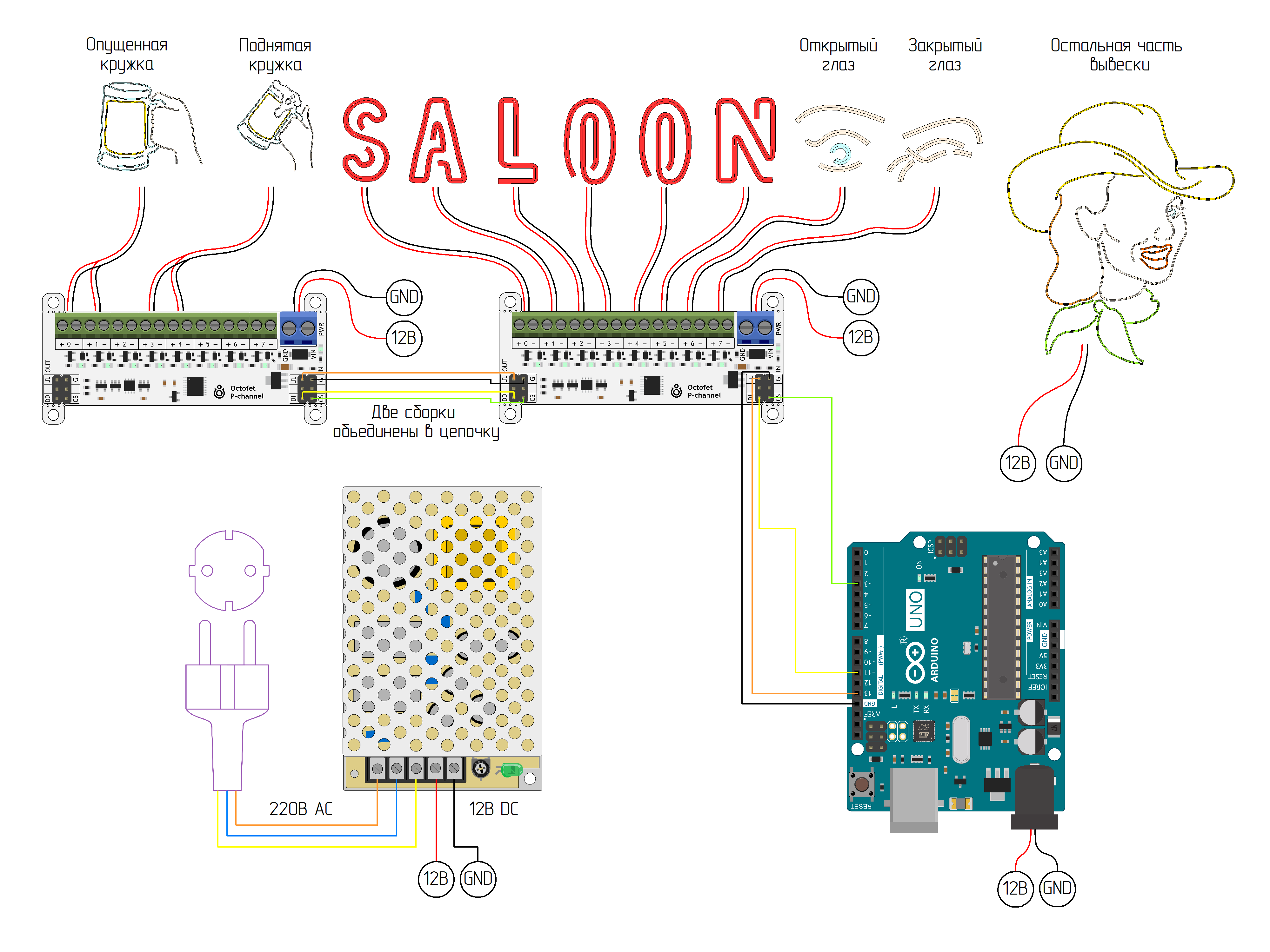CH11, CH12 — управление поднятой вверх кружкой пива. Эта часть вывески потребляет много тока. Мы объединили два канала в один для уменьшения нагрузки на транзистор.