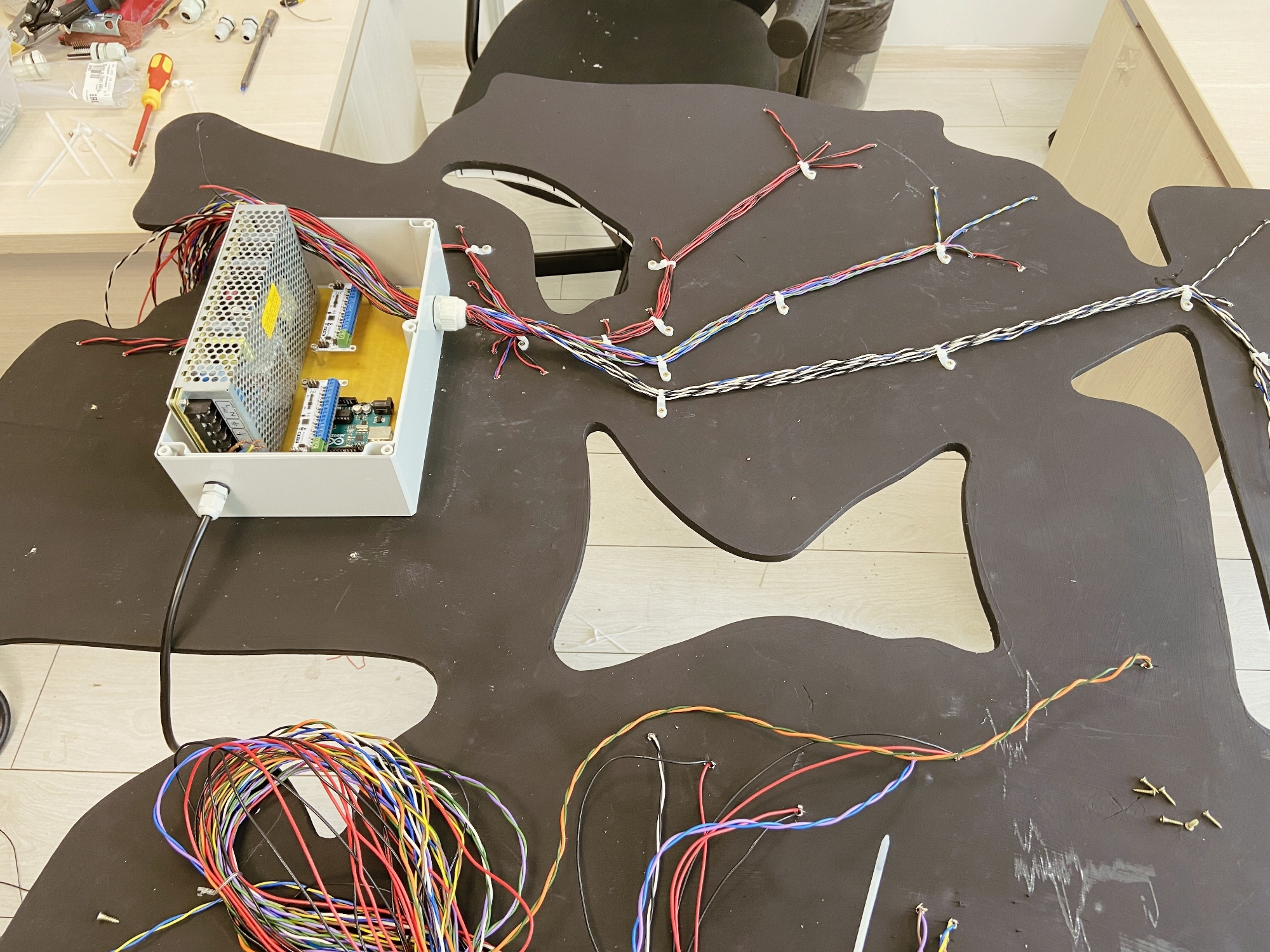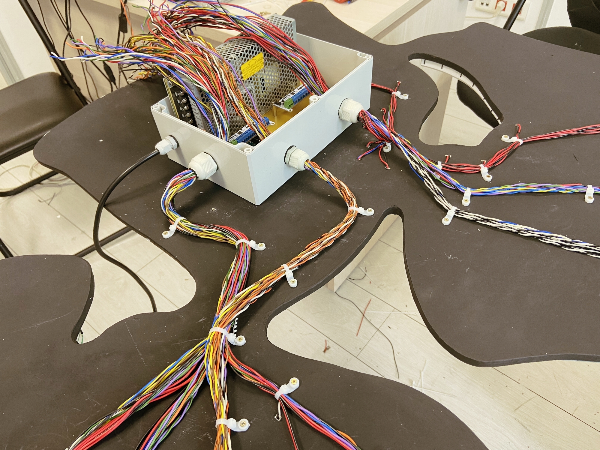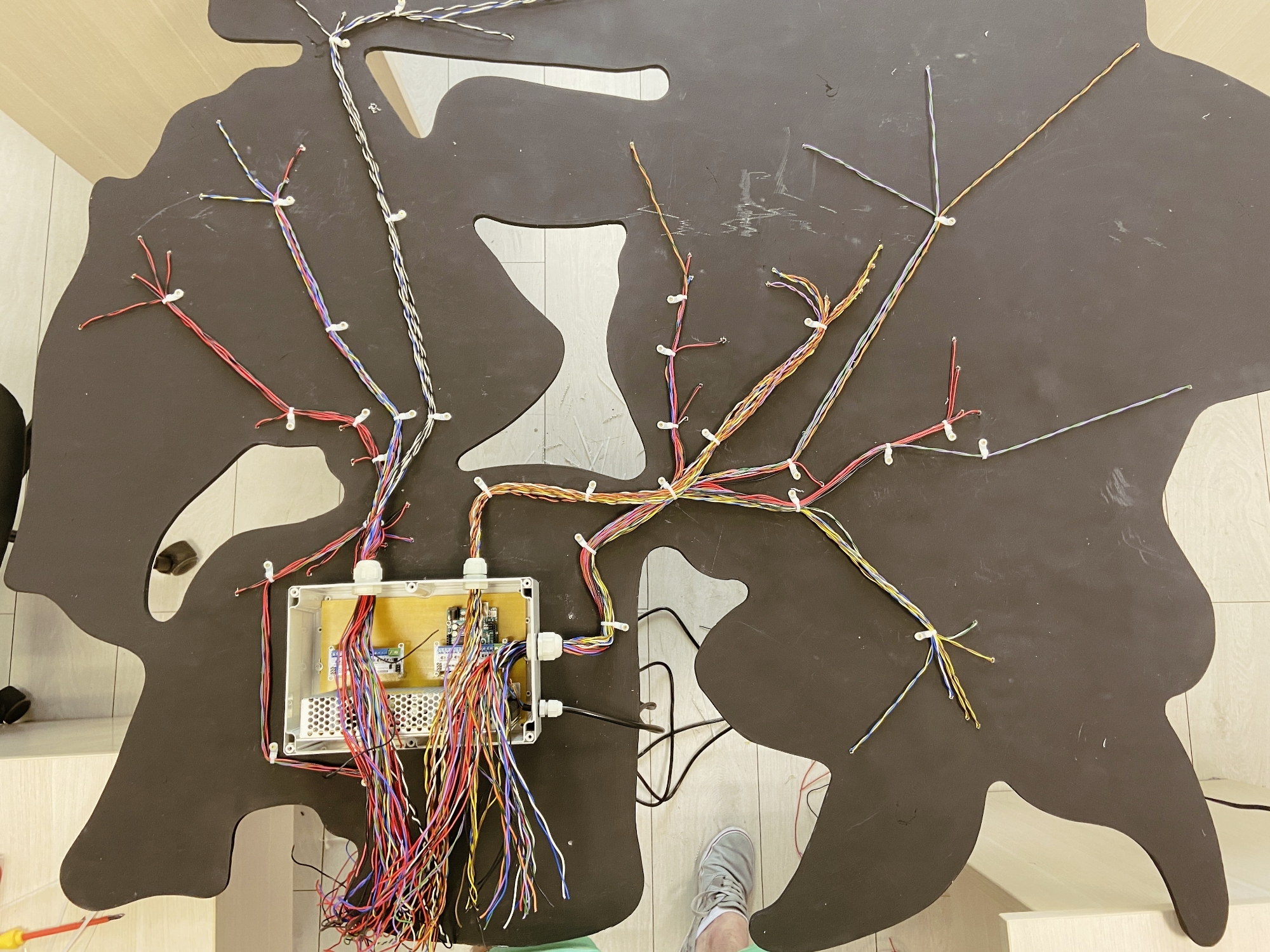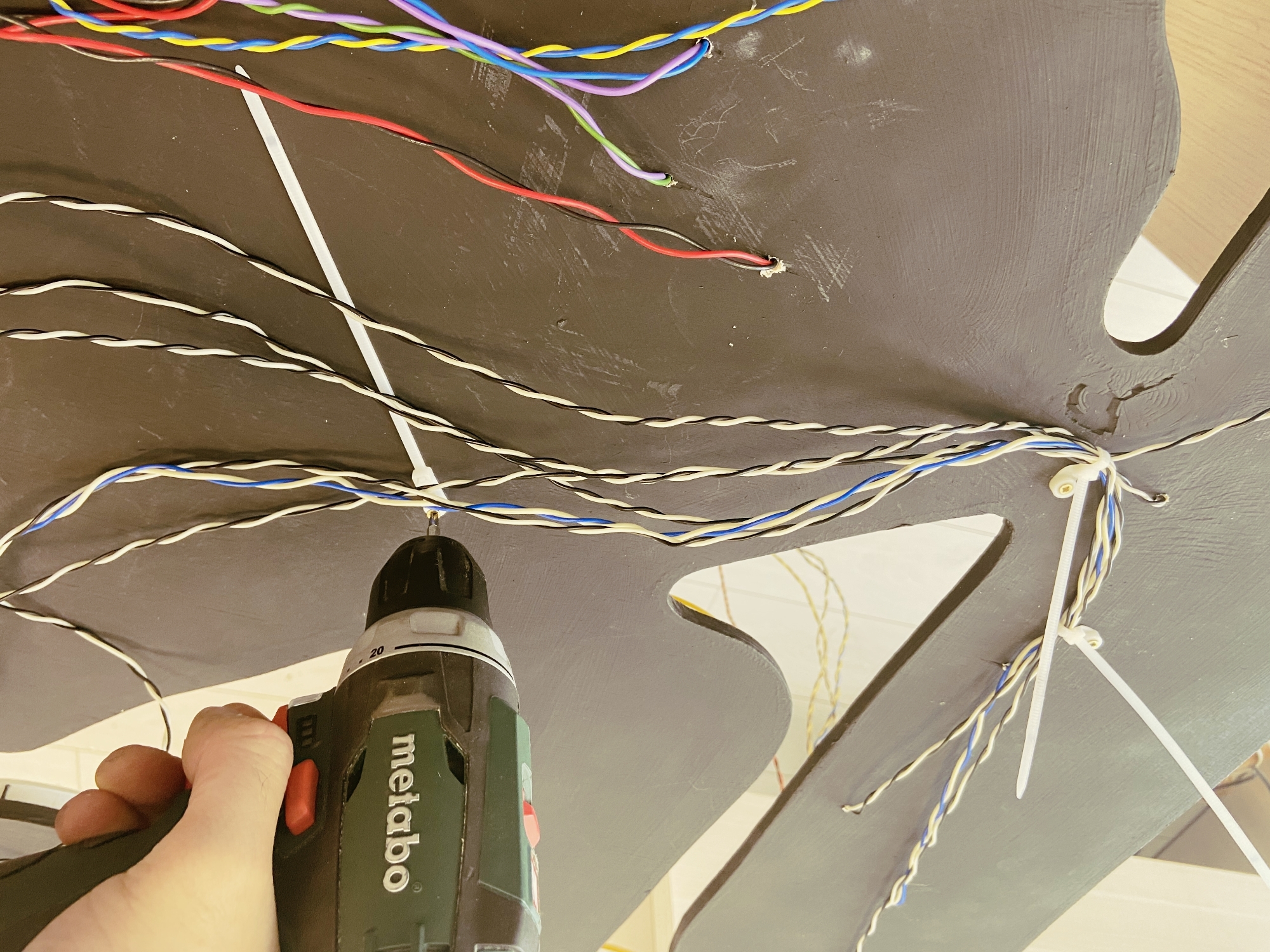 Пришло время протянуть все провода от всех неоновых лент в коробку с электроникой. Для фиксации проводов на основе вывески мы использовали кабельные стяжки.