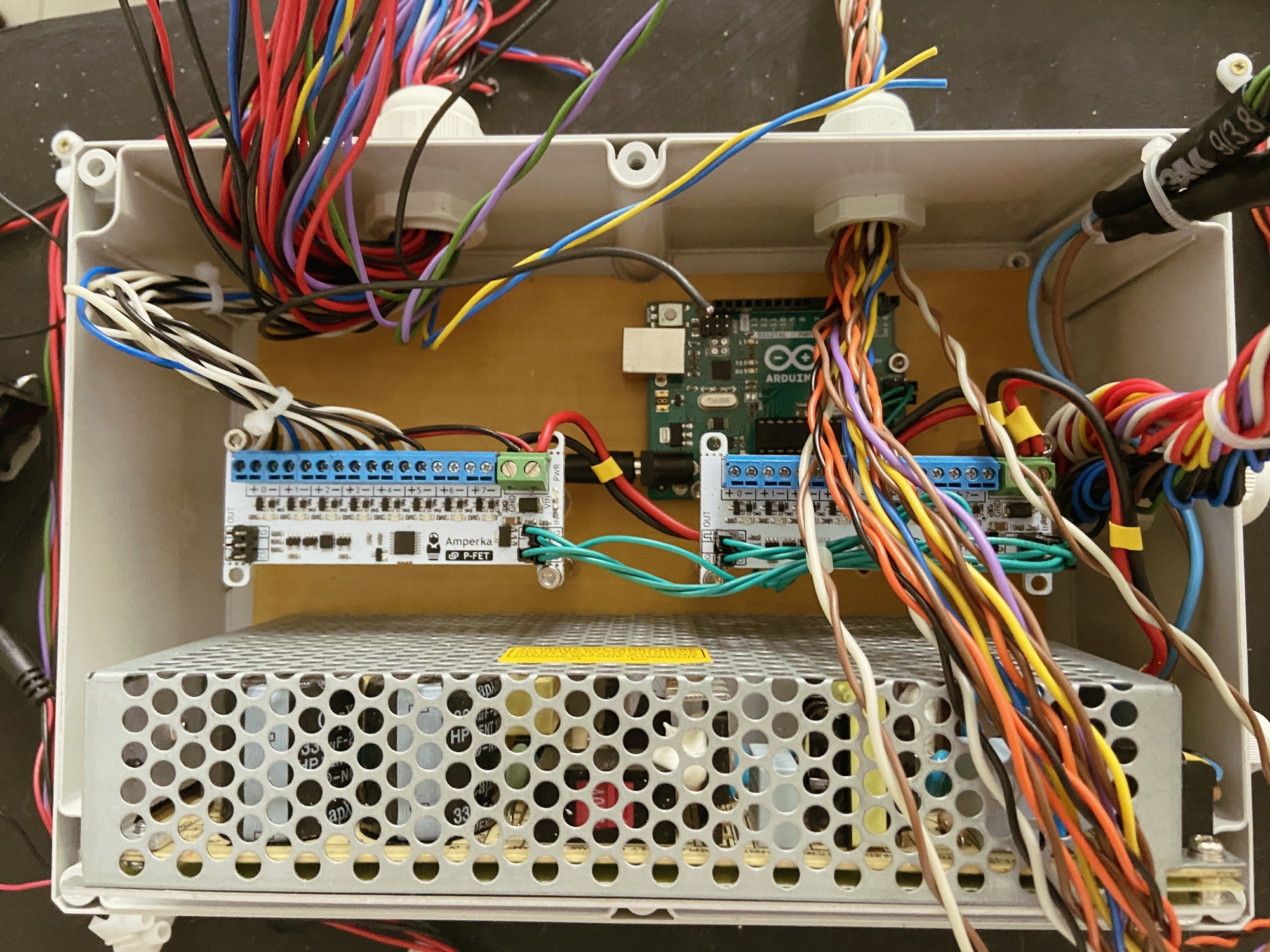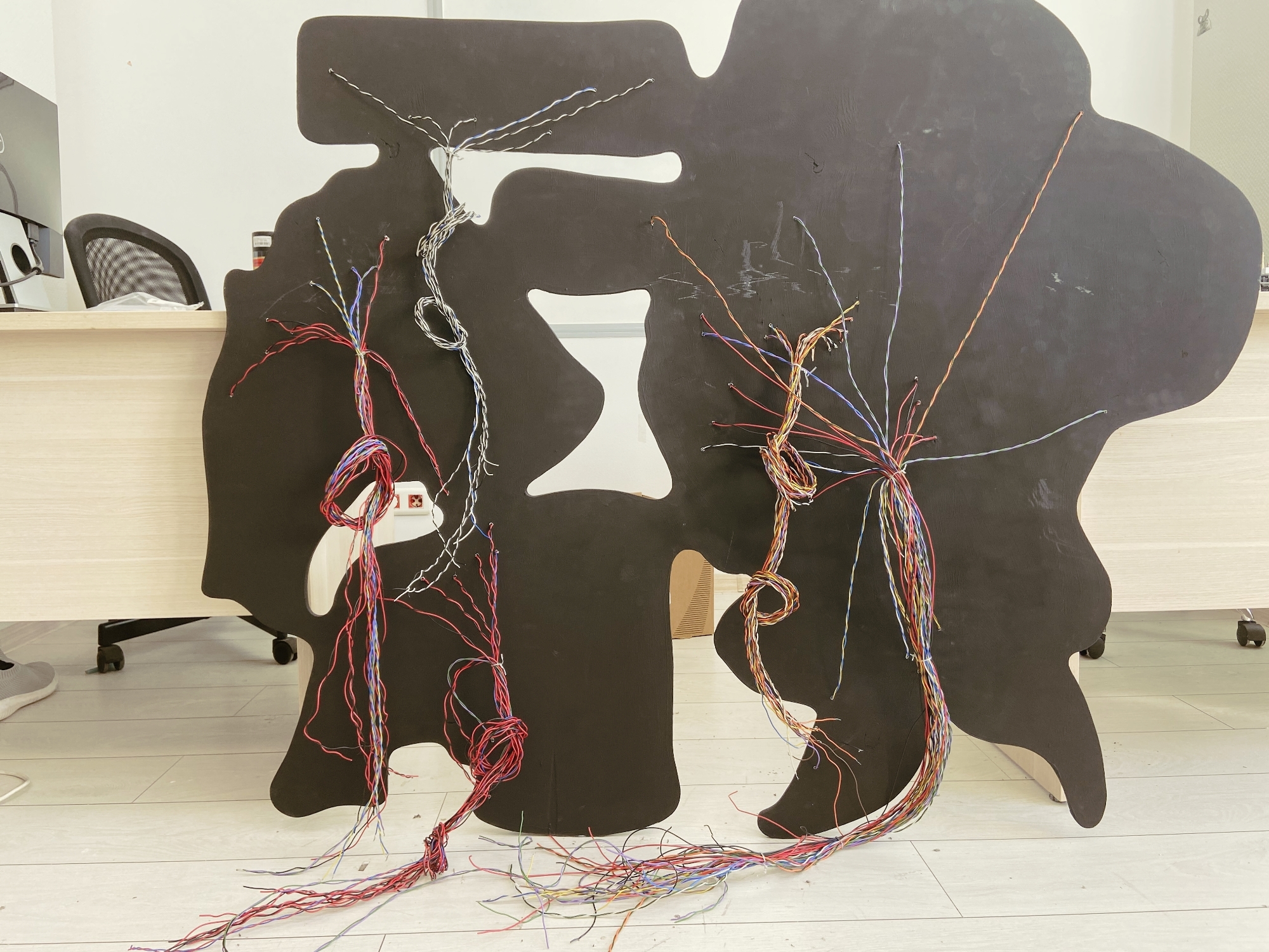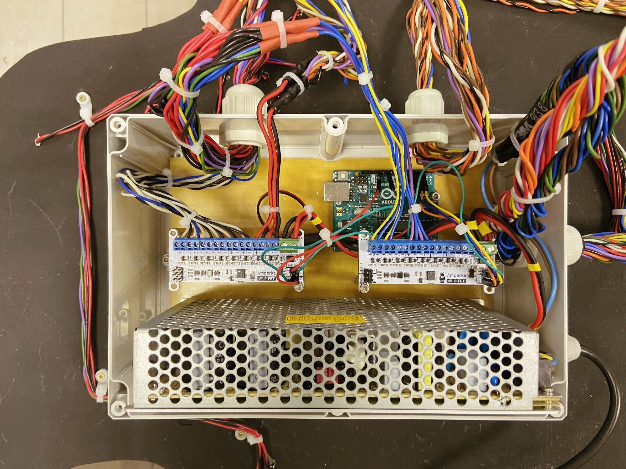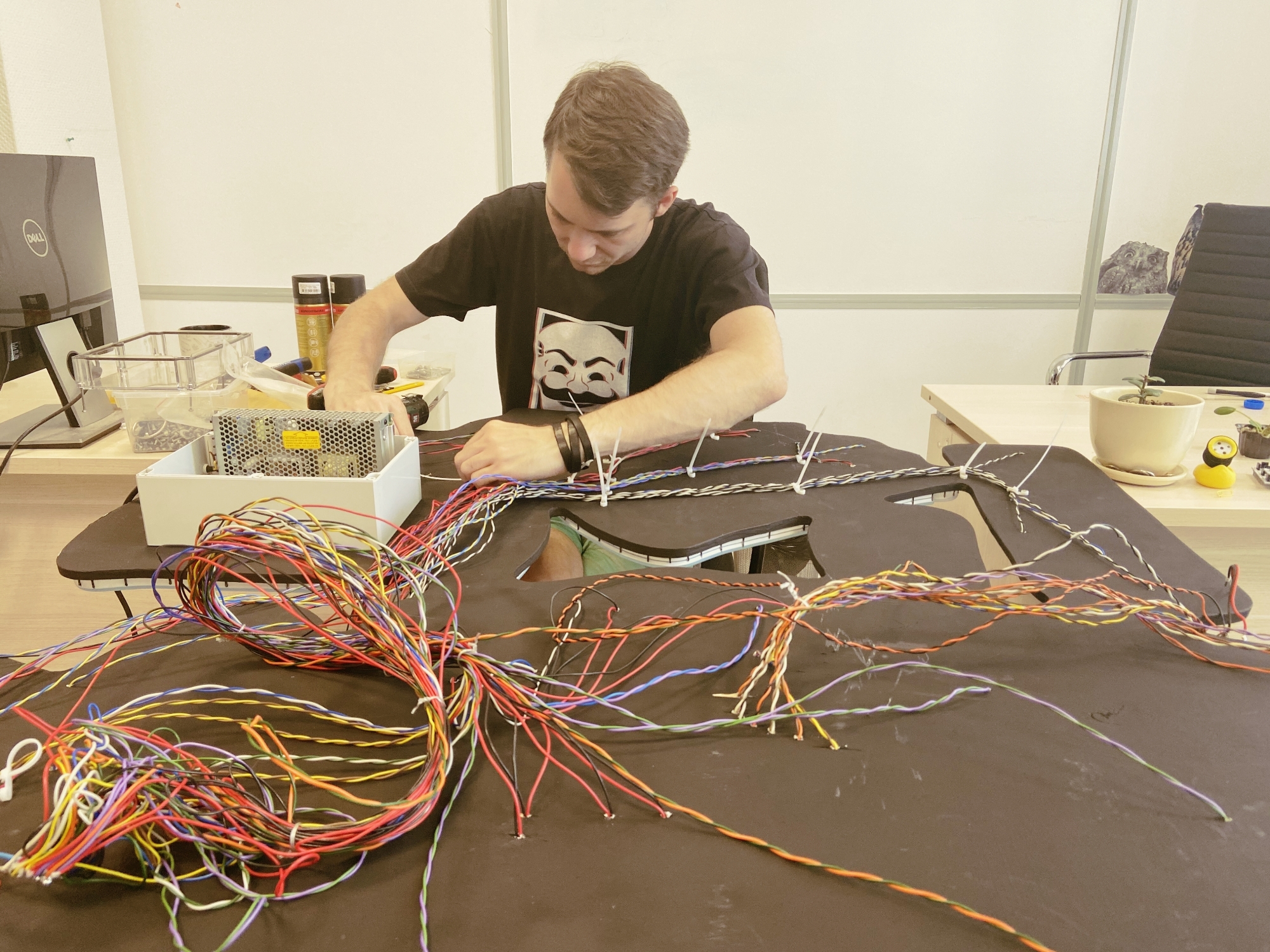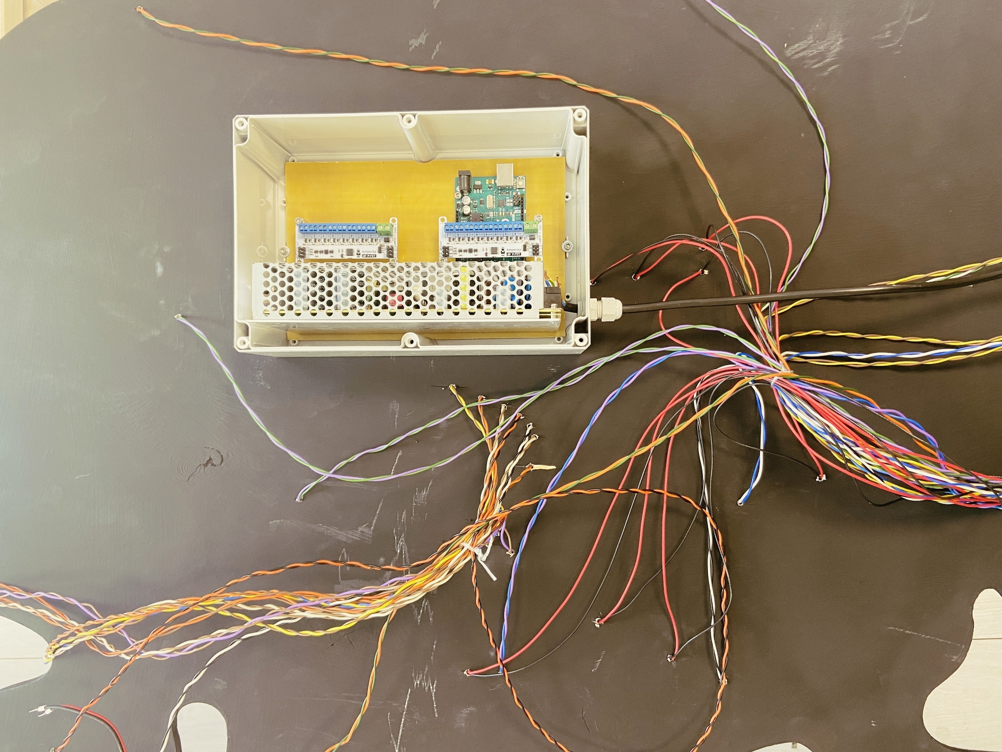 Пришло время протянуть все провода от всех неоновых лент в коробку с электроникой. Для фиксации проводов на основе вывески мы использовали кабельные стяжки.