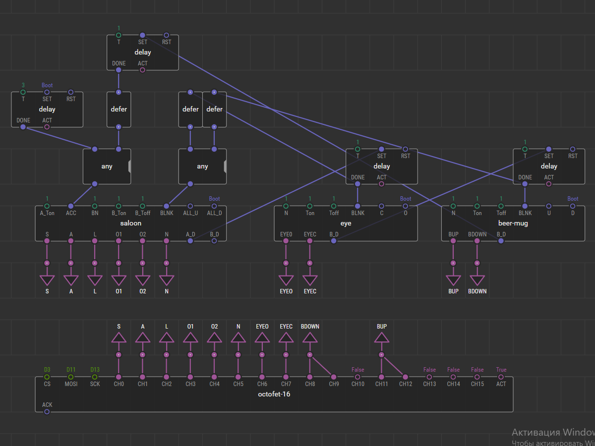 Нода saloon управляет надписью «Saloon», нода eye управляет подмигиванием глаза ковбойши, а нода beer-mug управляет пивной кружкой. Эти ноды составные и, по сути, состоят из счётчиков и генераторов прямоугольных импульсов. Помимо этого на патче находится нода octofet-16 из библиотеки amperka/octofet. Эта нода отвечает за работу двух сборок силовых ключей, объединённых в цепочку.
