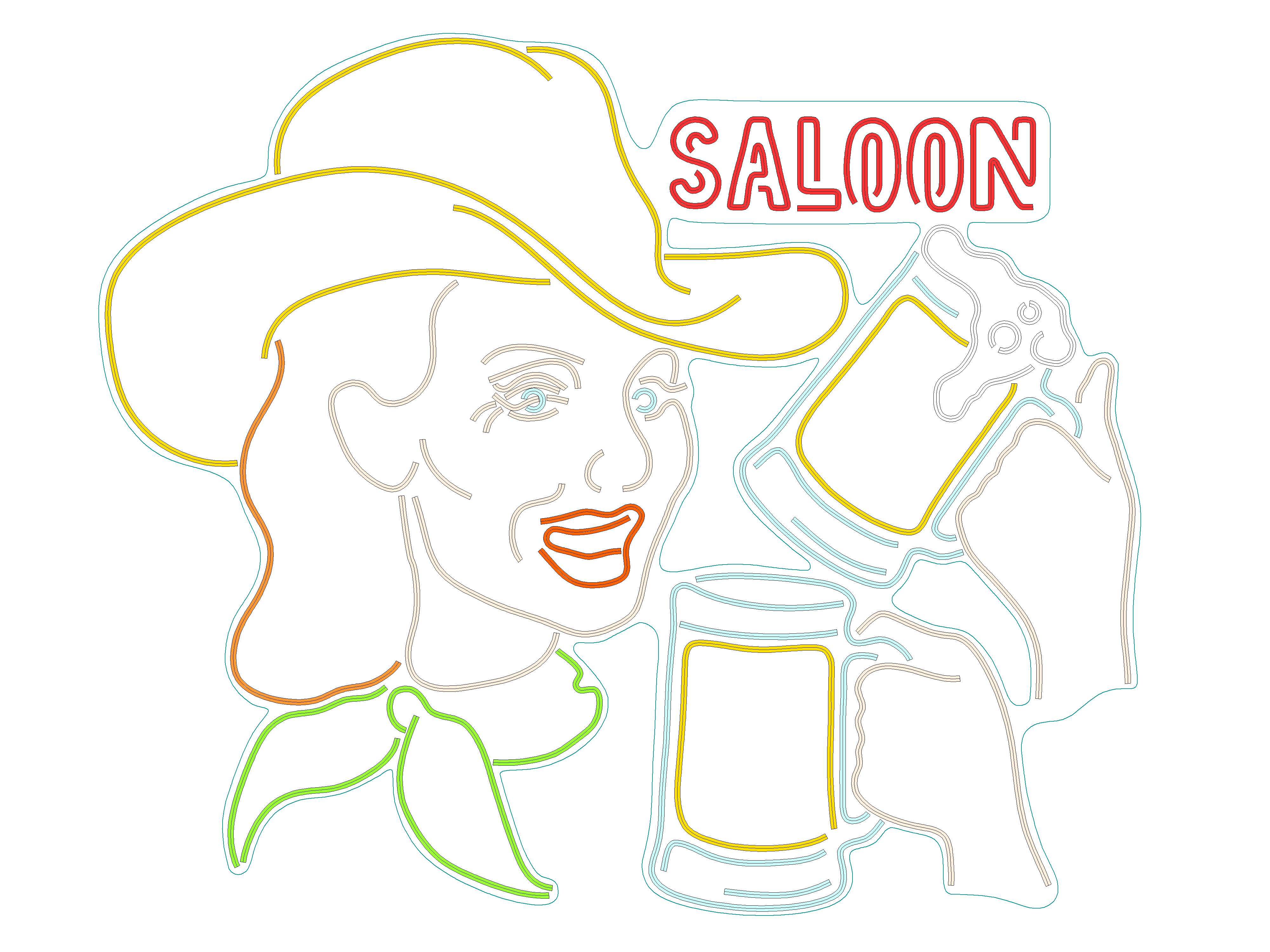 У нашей ковбойши жёлтая шляпа и зелёный шейный платок. Мы добавили персонажу две простые анимации. Первая — ковбойша подмигивает глазом. Вторая — ковбойша поднимает свою кружку с пивом и опускает её, слегка выплёскивая пивную пену. Также мы добавили в верхний правый угол вывески слово «Saloon», которому сделали световые эффекты, например, мигание или «бегущий огонёк».