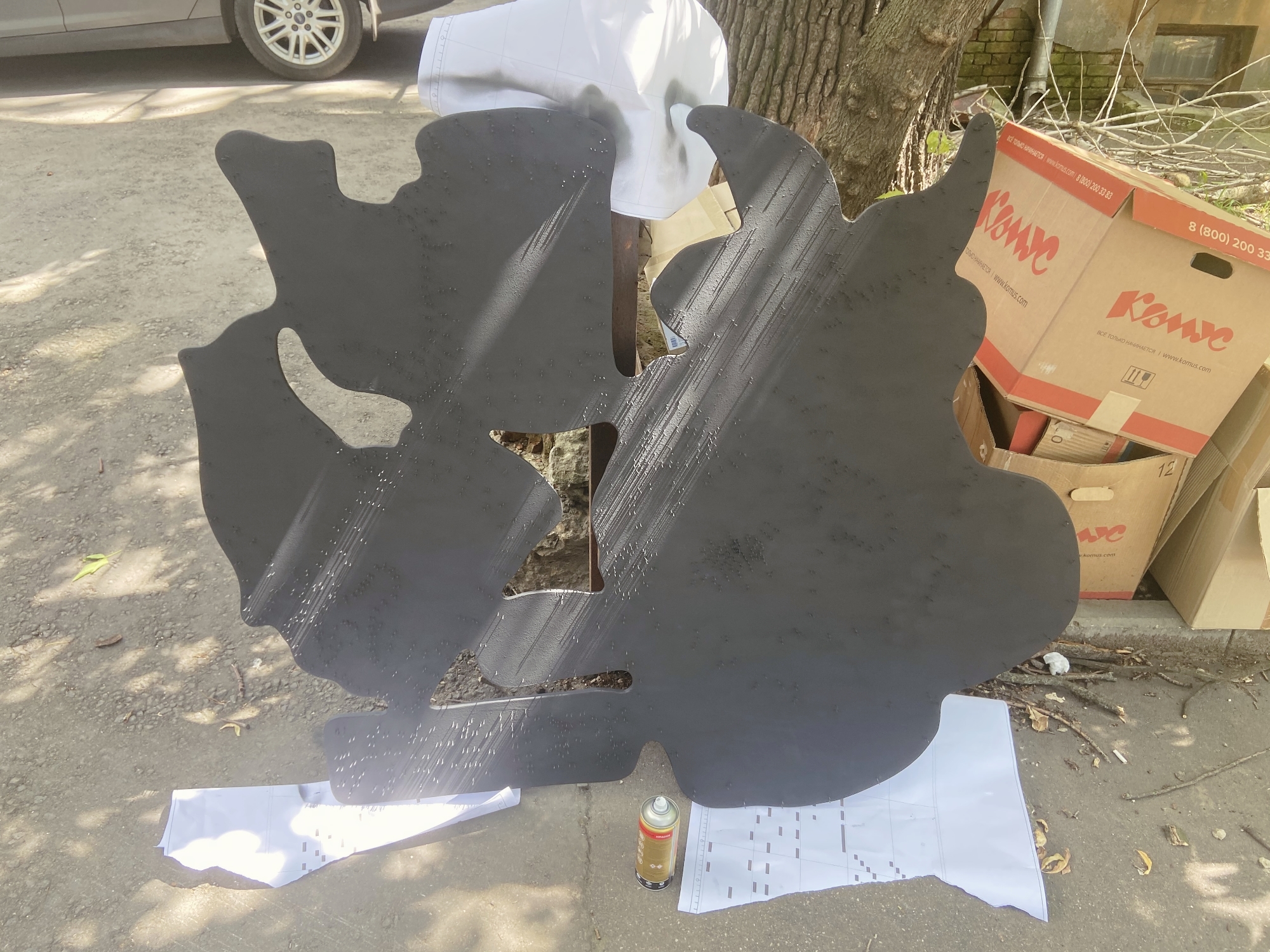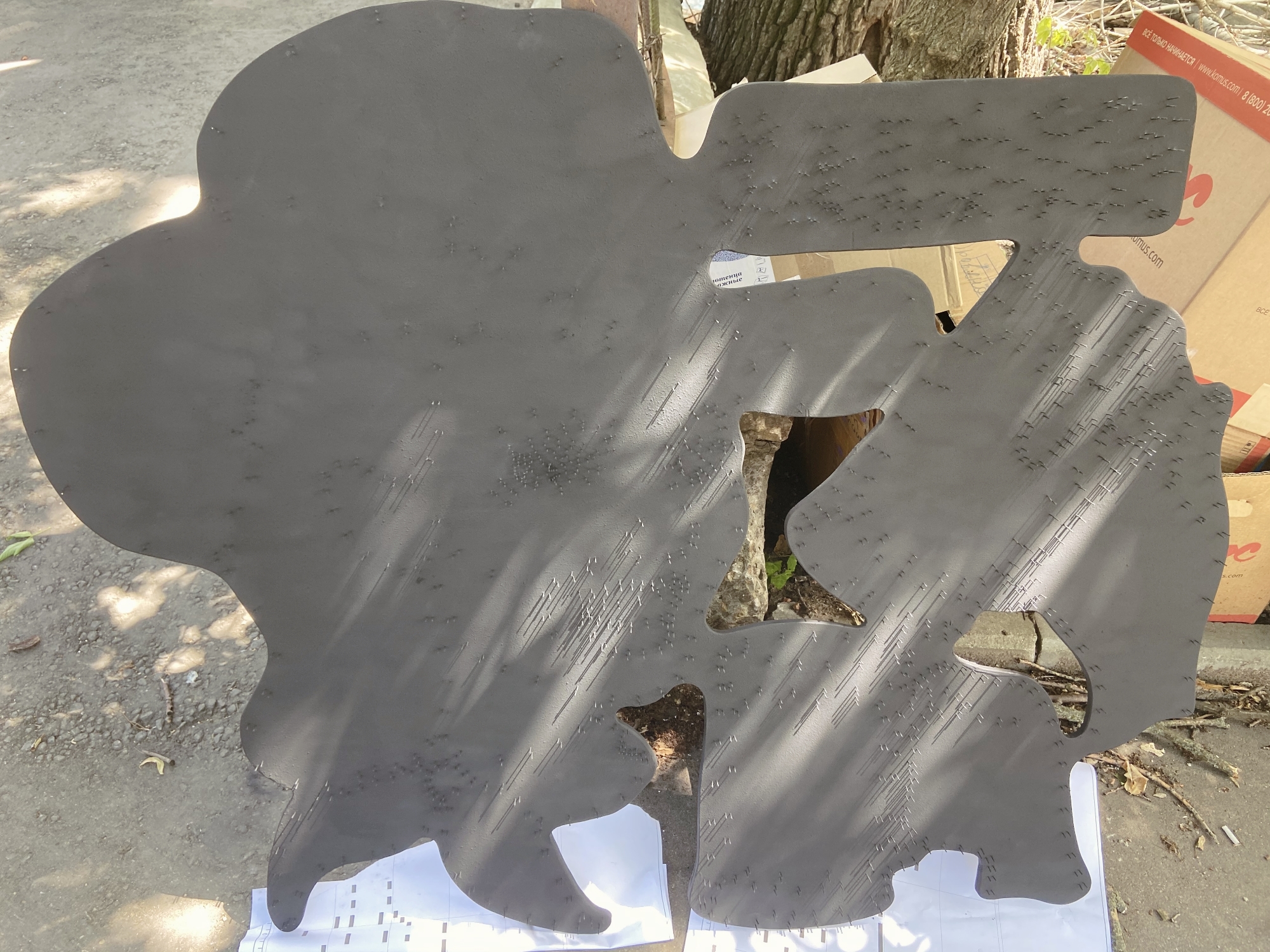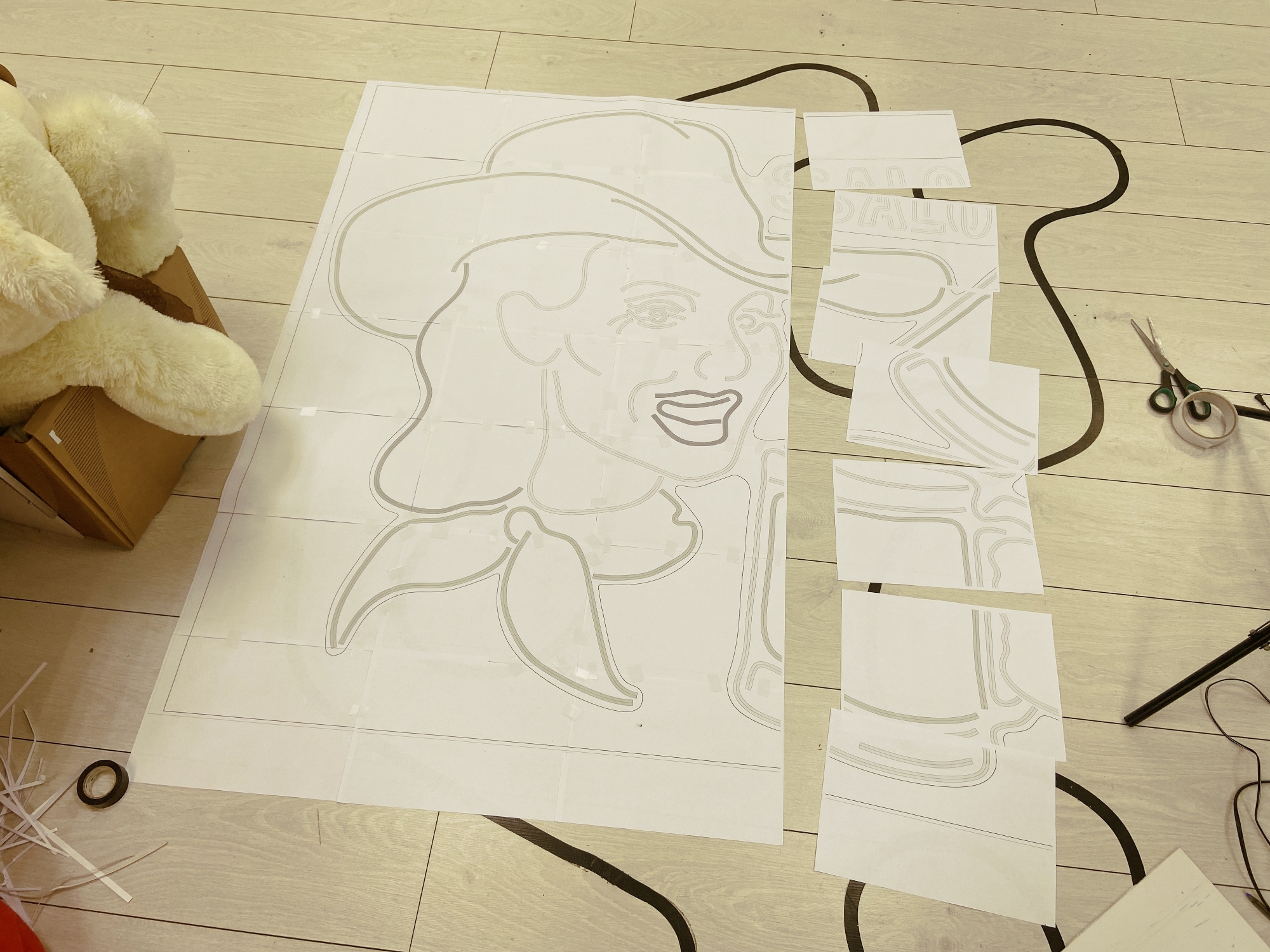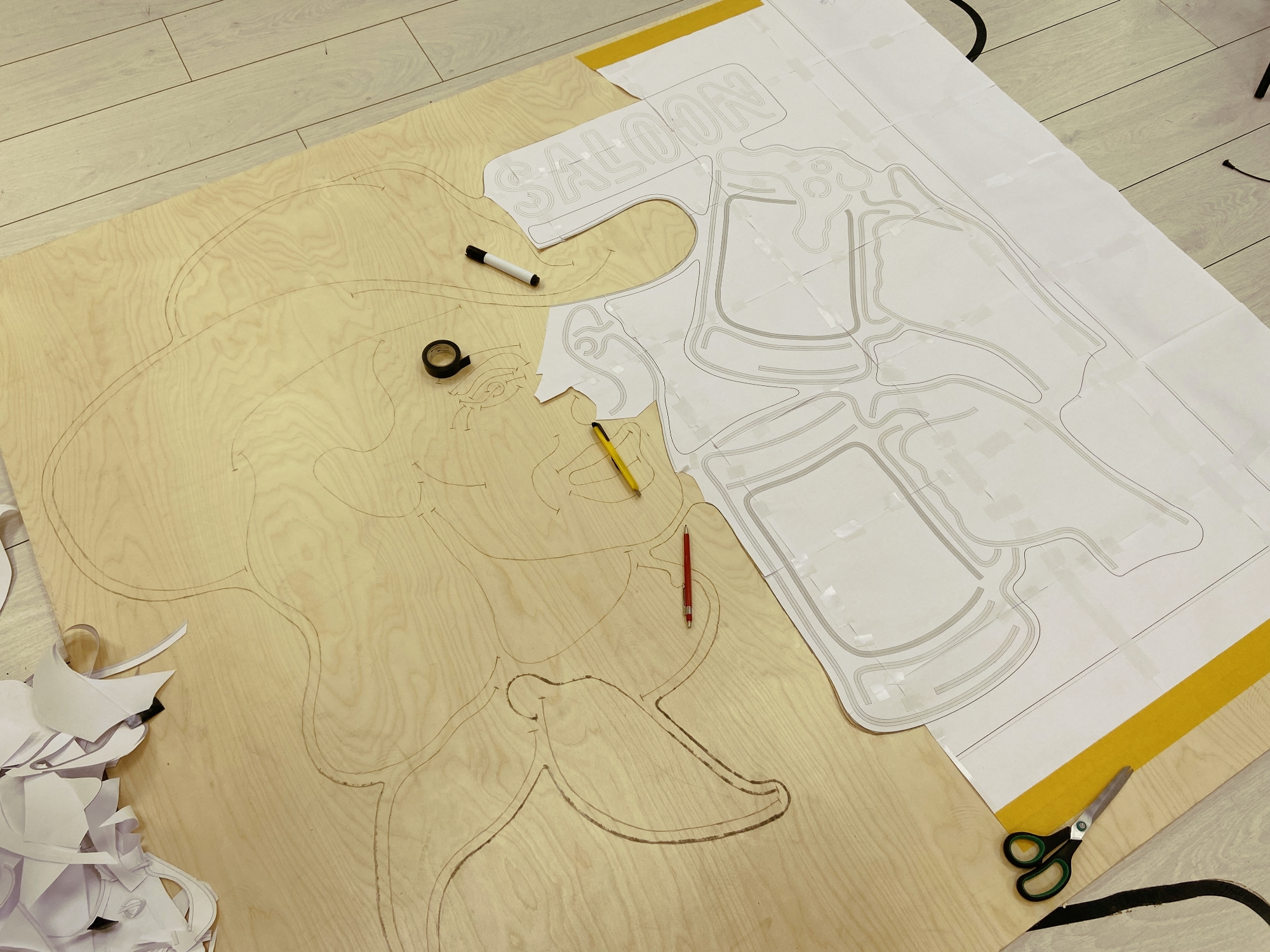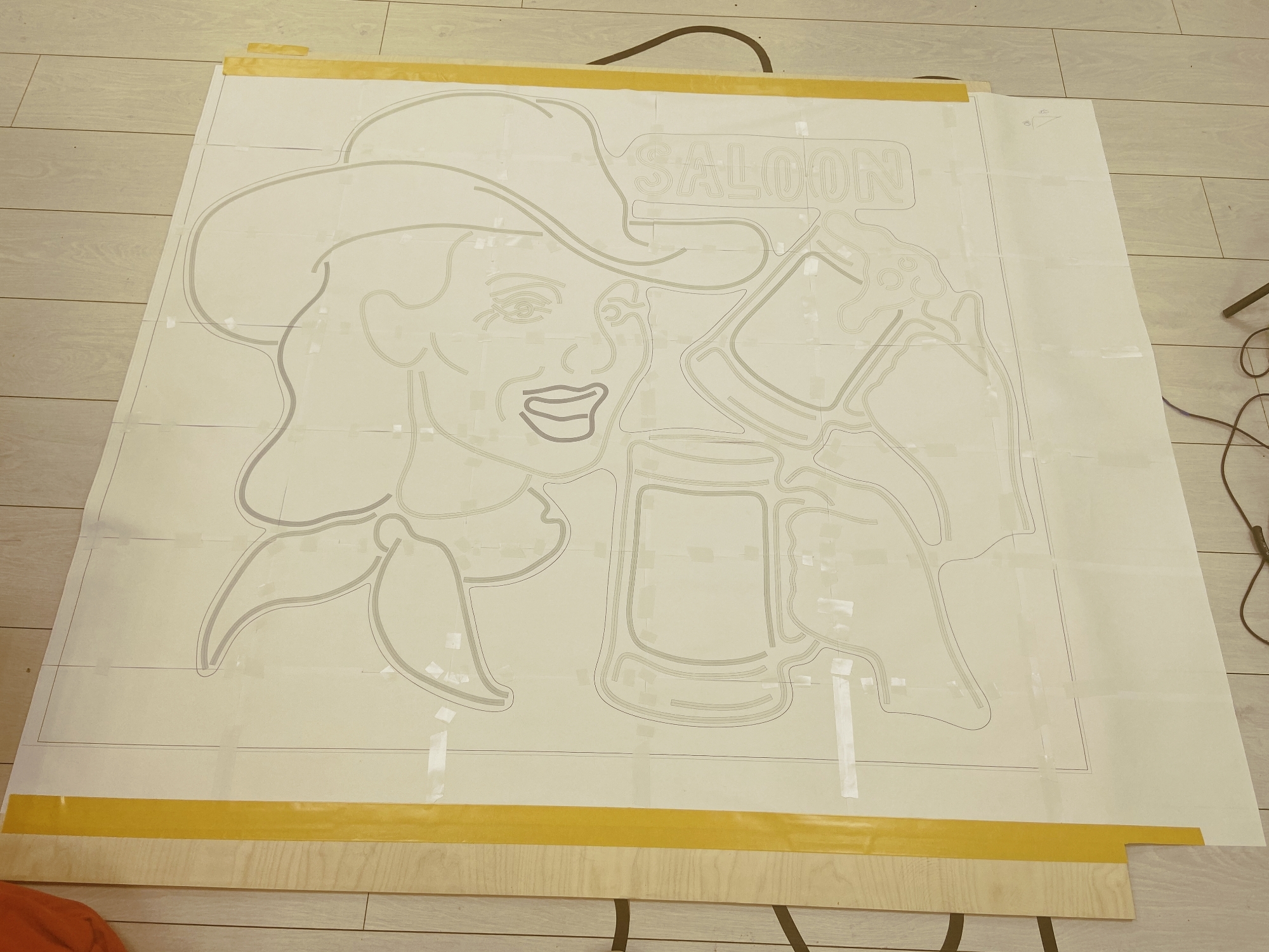 Перенесите готовый чертёж на вашу основу для вывески. Для переноса нашего рисунка мы распечатали его в масштабе 1:1 на нескольких листах А4 и склеили листы между собой.