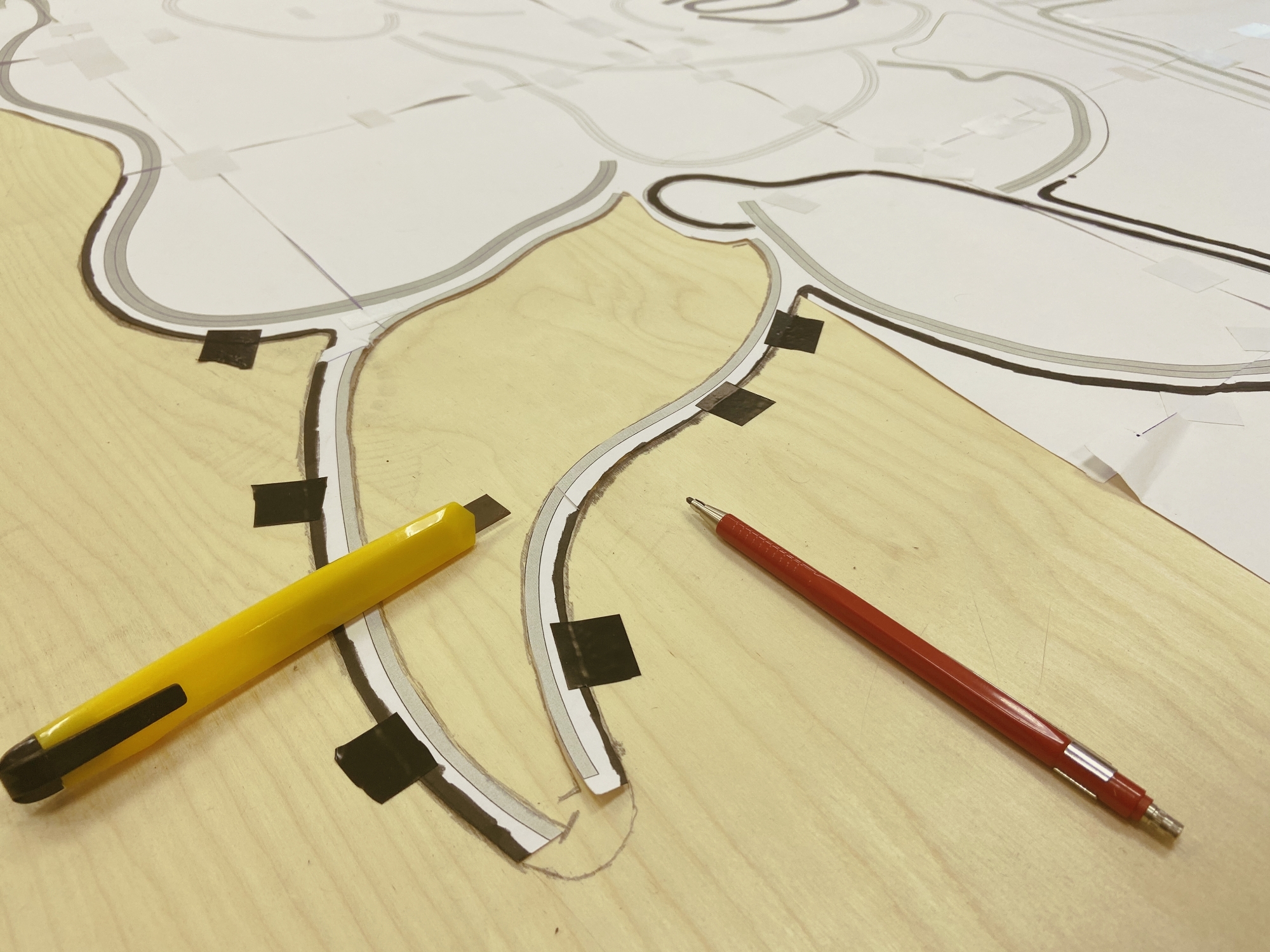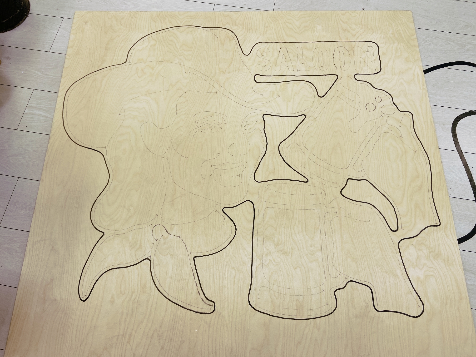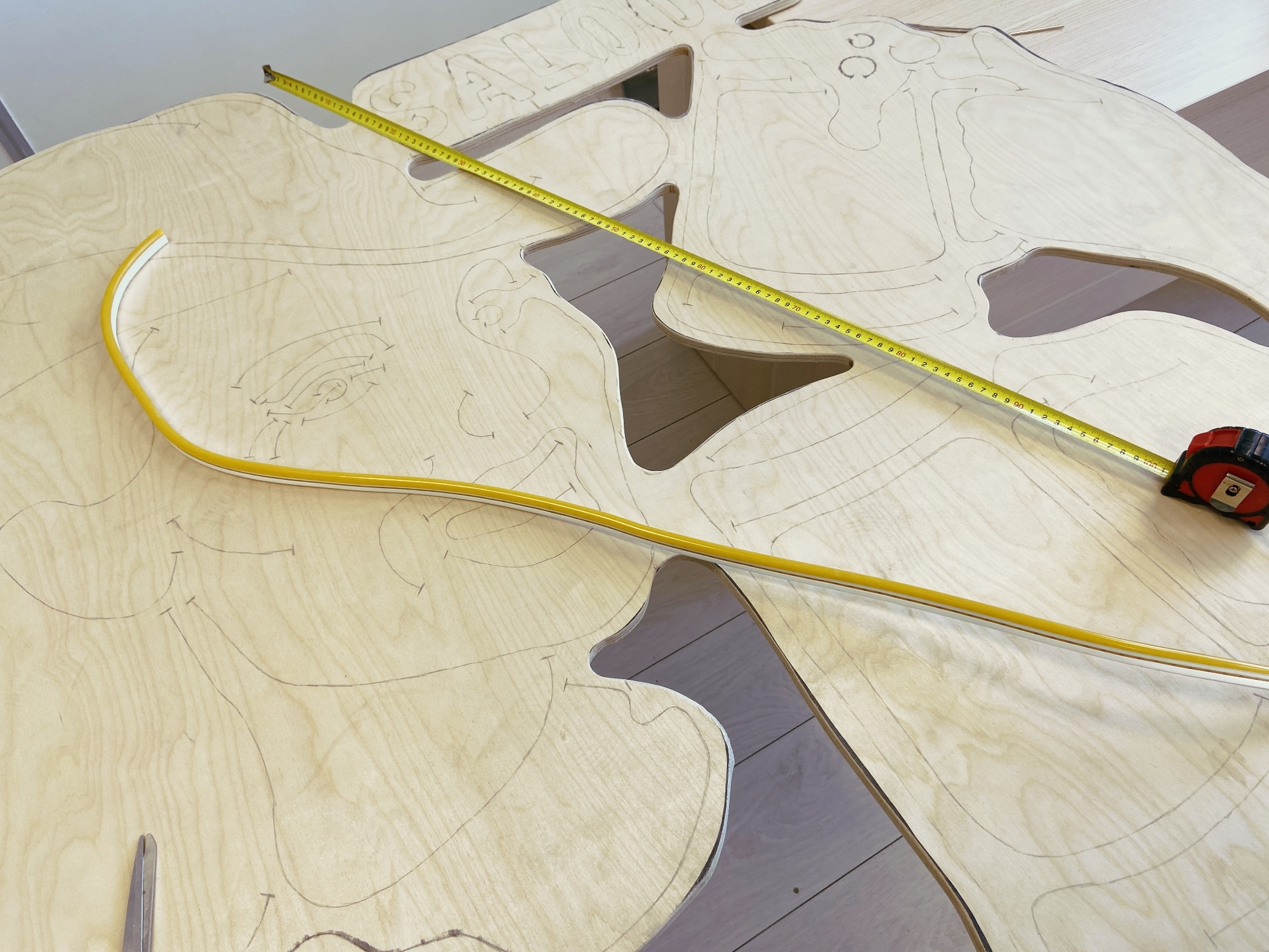 Затем мы постепенно отрезали контуры с бумаги и повторили их карандашом на фанере. На основу нужно перенести как контуры светодиодных лент, так и контур всей вывески.