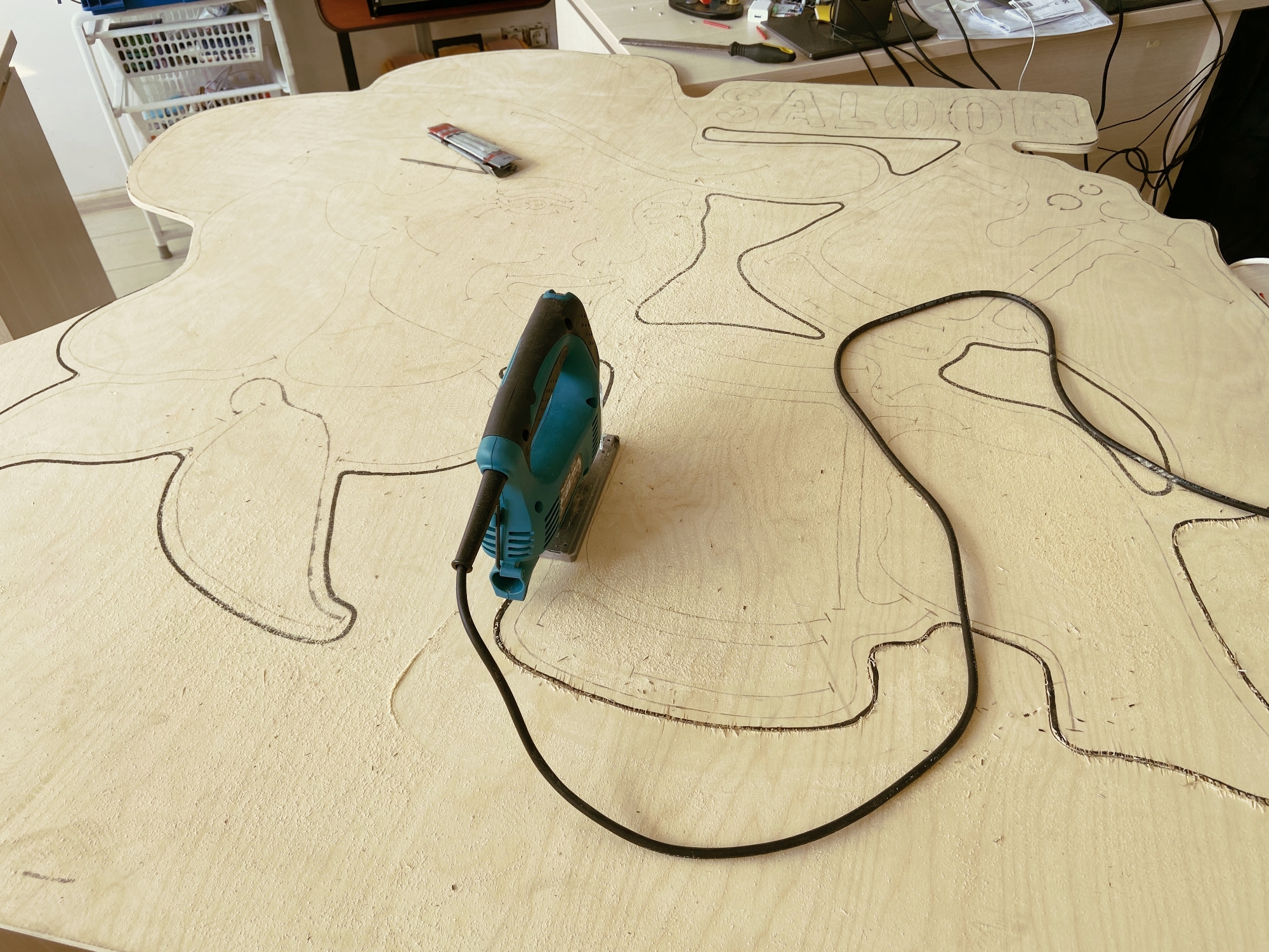 Когда все контуры перенесены на основу, можно выпилить контур вывески. Мы использовали электролобзик с пилкой по дереву.