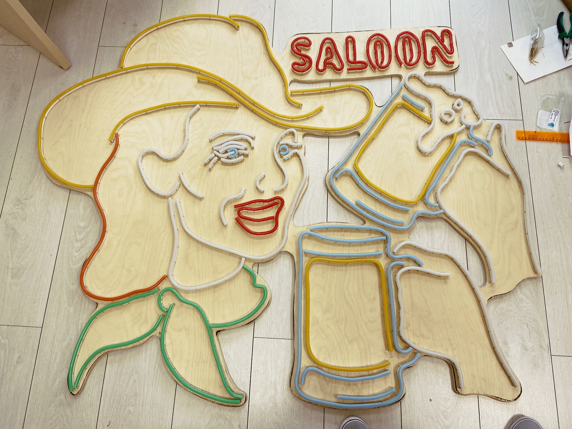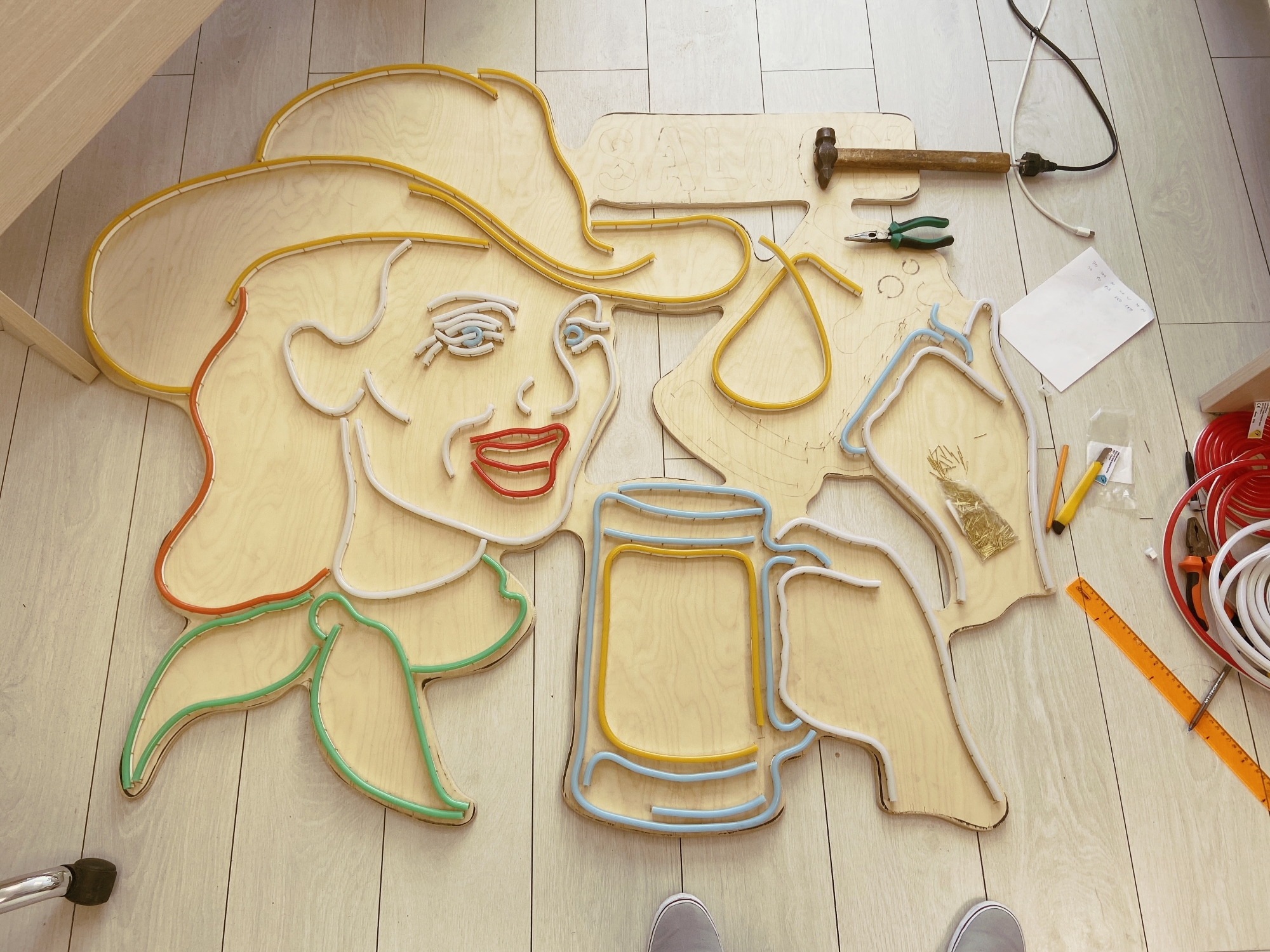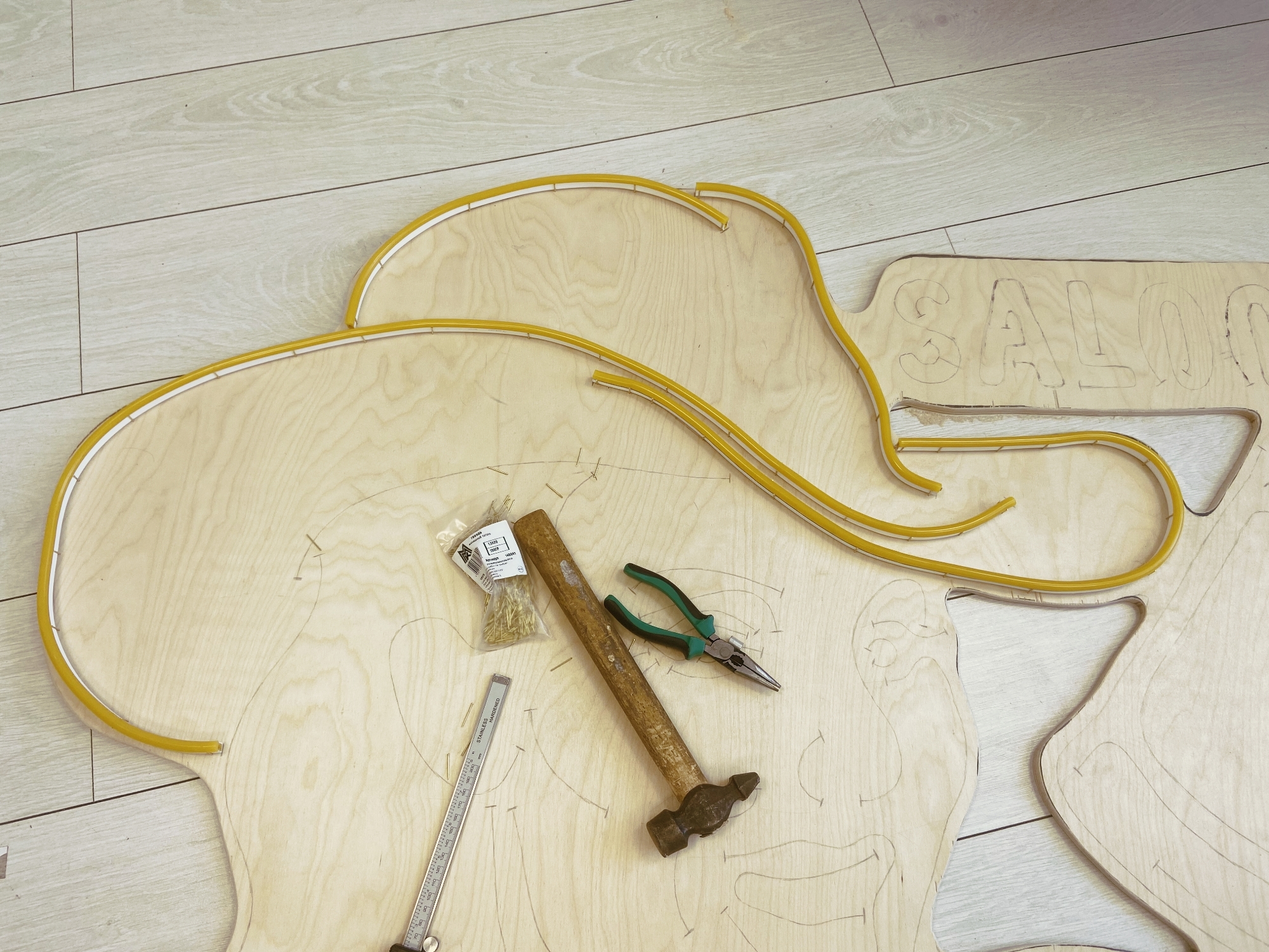 Примерьте все отрезки неона согласно чертежу. Убедитесь, что все размеры сошлись с чертежом и вывеска выглядит так, как вам нужно. Сейчас последний шанс что-то подправить: например, укоротить или удлинить тот или иной отрезок, изменить изгиб или вбить больше фиксирующих гвоздей.