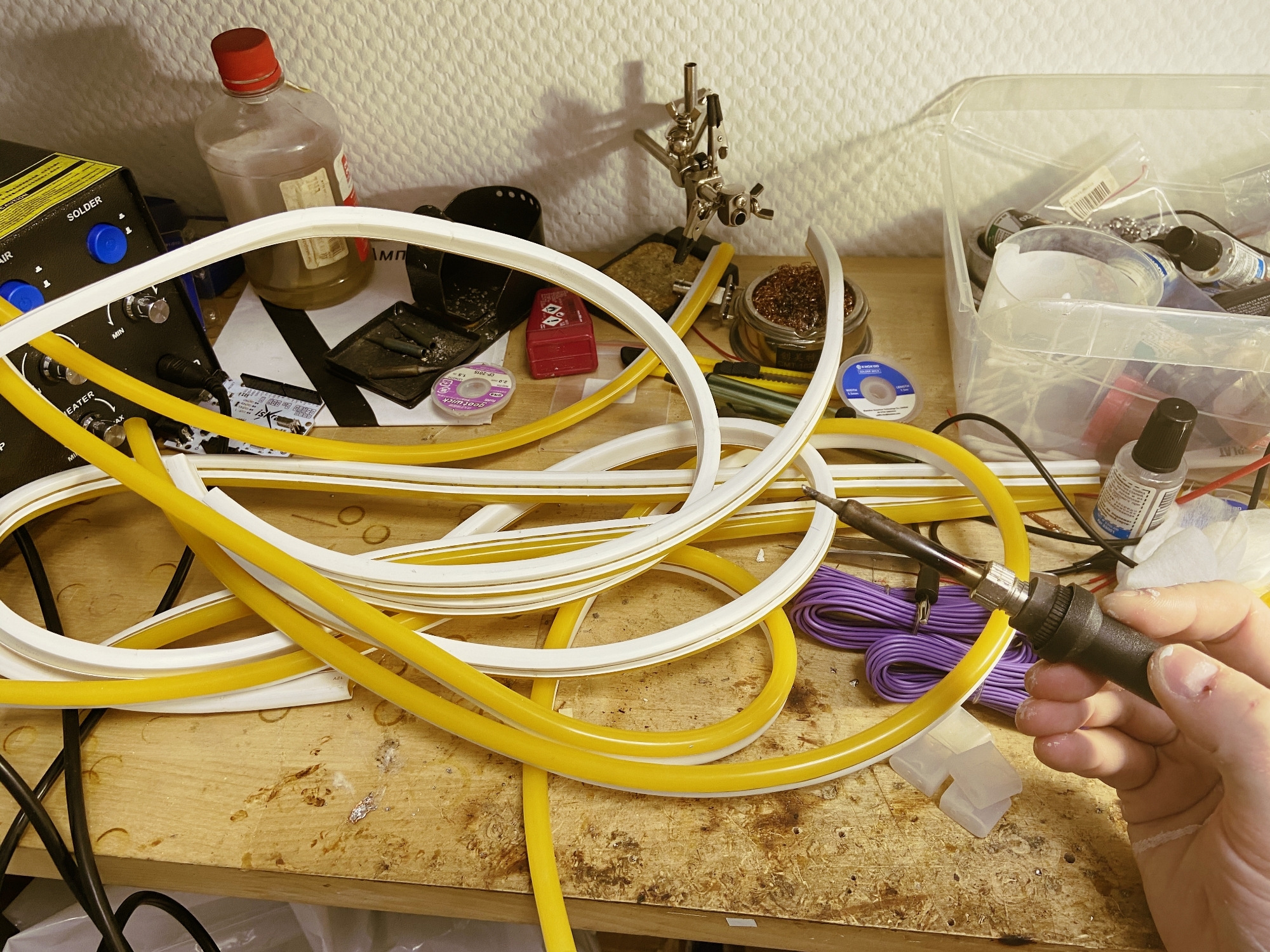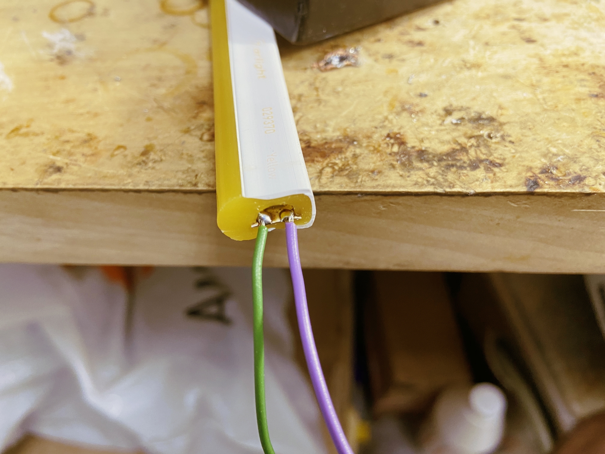 Провода нужно припаять к одному торцу каждого отрезка гибкого неона. Всего нужно два провода: один на плюс, другой — на минус.
