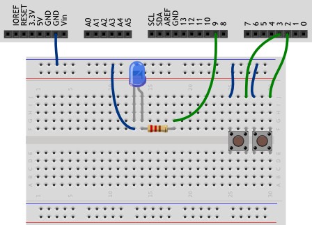 В этом эксперименте мы добавляем порцию яркости светодиоду одной кнопкой и убавляем другой.