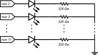 // в шкале 10 светодиодов. Мы бы могли написать pinMode 10