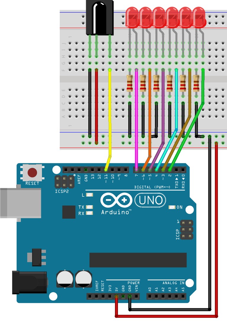 LED1 … LED6 → пины 2–7 через резисторы 220 Ω