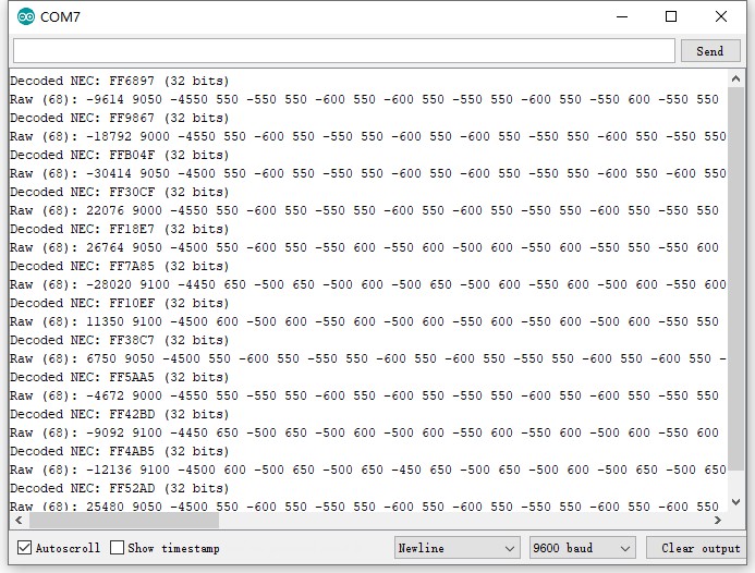 После загрузки скетча откройте Serial Monitor на 9600 бод. При нажатии кнопок пульта будут выводиться строки «Decoded NEC: XXXXXXX» — шестнадцатеричные коды кнопок.