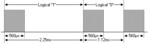 pulse-distance modulation): логические 0 и 1 различаются длиной паузы после импульса, а не длительностью самого импульса (он всегда 562 µs).Несущая частота — 38 кГц, ширина импульса 562 µs содержит ~21 цикл.
