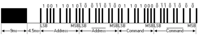 32 бит полезных данных (LSB → MSB): адрес, ~адрес, команда, ~команда.