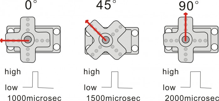 Угол поворота сервомотора контролируется скважностью сигнала ШИМ (широтно-импульсная модуляция). Стандартный цикл сигнала — 20 мс (50 Гц), ширина импульса — от 1 до 2 мс (угол от 0° до 180°). Для разных брендов значения могут отличаться.