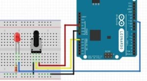 Примером реализации схемы подключения потенциометра может стать макетная плата с подключенным переменным резистором и светодиодом. При помощи потенциометра будет выполняться управление уровнем яркости свечения.