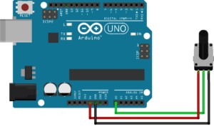 В плату Ардуино встроен аналого-цифровой преобразователь, способный считывать напряжение и переводить его в цифровые показатели со значением от нуля до 1023. При повороте указателя до конечного значения в одном из двух возможных направлений, напряжение на пине равно нулю, и, следовательно, напряжение, которое будет генерироваться составляет 0 В. При повороте вала до конца в противоположном направлении на пин поступает напряжение величиной 5В, а значит числовое значение будет составлять 1023.