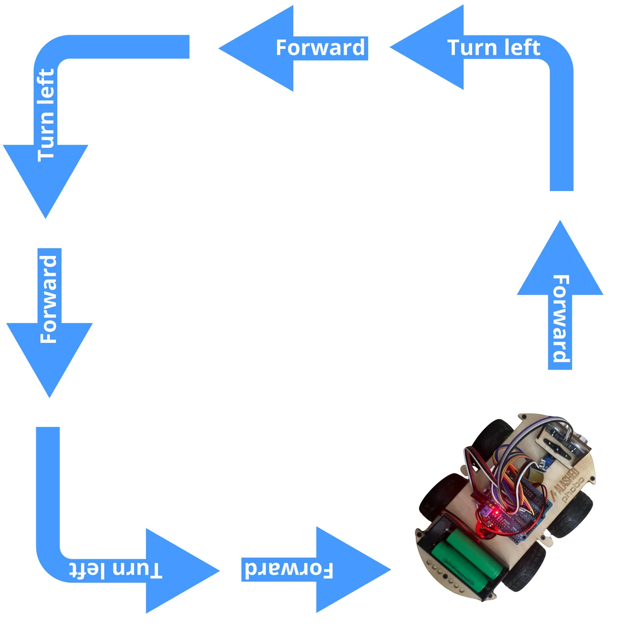 Робот Фобо сам поедет по квадрату: вперёд → поворот 90° → вперёд → поворот → 4 раза и вернётся примерно на старт!