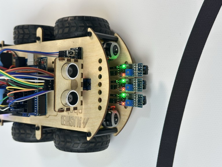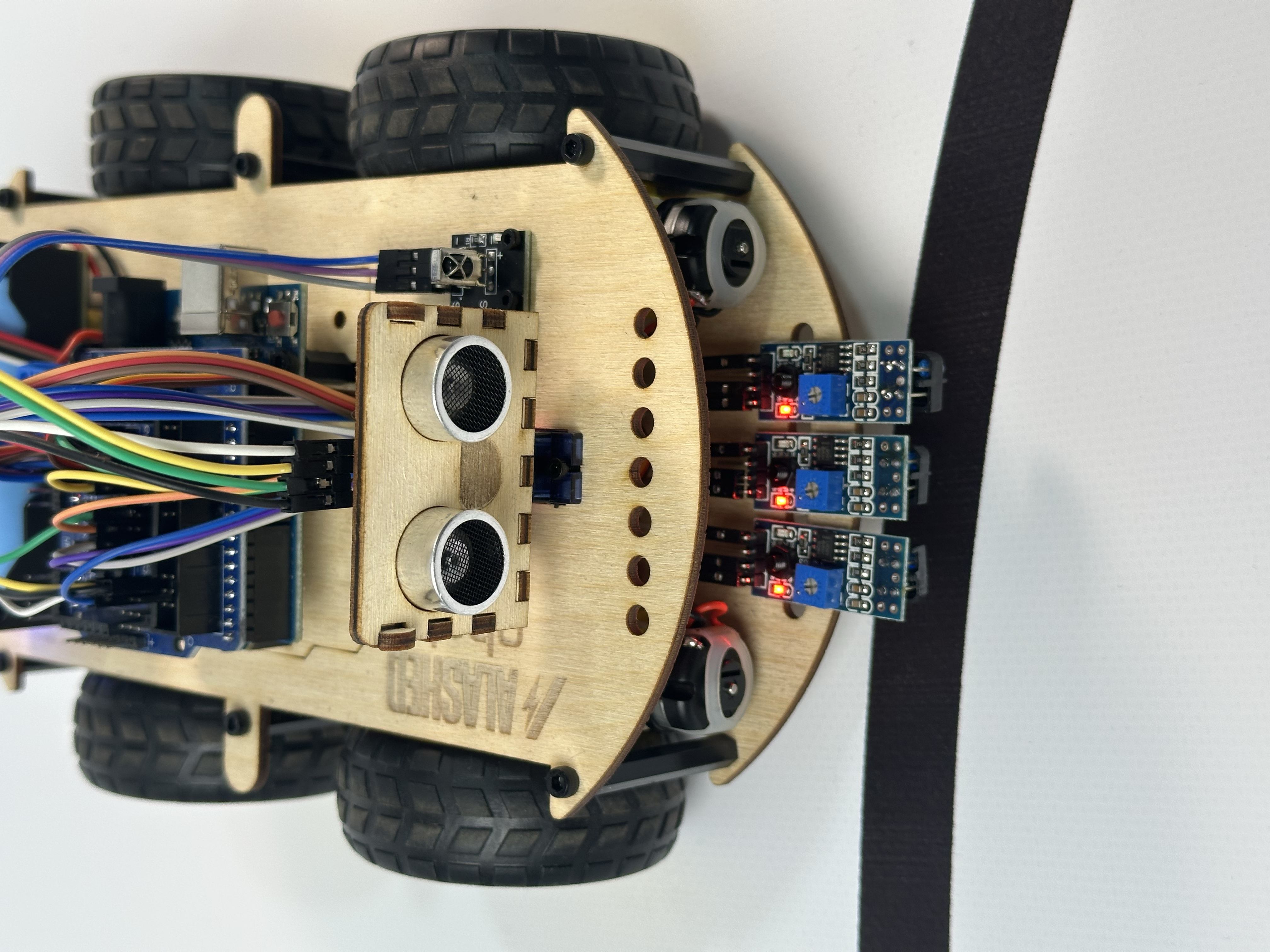 У робота Phobo три датчика линии расположены под передней частью: левый, центральный и правый. Они работают как команда: если робот отклоняется влево, левый датчик это обнаружит; если вправо — сработает правый датчик. Центральный датчик помогает понять, что робот движется точно по линии.