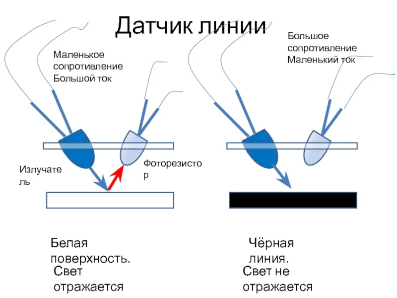 Свет отражается от поверхности по-разному в зависимости от её цвета: - Белая поверхность (или светлая) отражает ~80-90% света → фототранзистор получает много света → высокое значение (800-1023) - Чёрная линия (или тёмная) поглощает ~90-95% света → фототранзистор получает мало света → низкое значение (0-200)