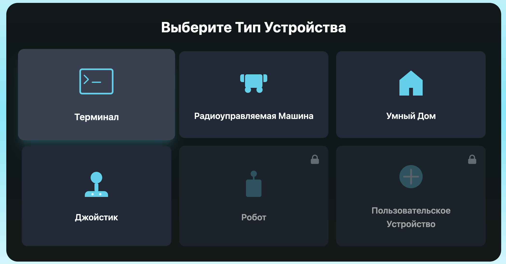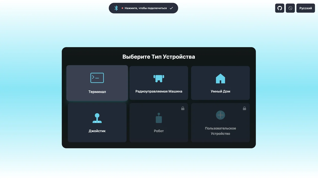 ✅ 4 режима работы — Terminal, RC Car, Joystick, Smart Home