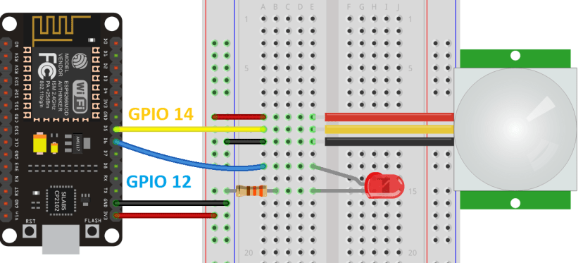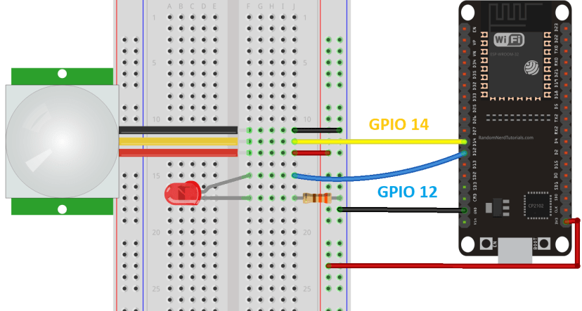 Далее в коде нам нужно создать два объекта Pin. Один для светодиода на GPIO 12, а другой для PIR-датчика движения на GPIO 14.