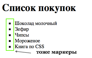 Как видите, слева от пунктов списка, есть так называемые маркеры. В первом пример - в виде черных кружочков. Во втором - в виде черных квадратиков.