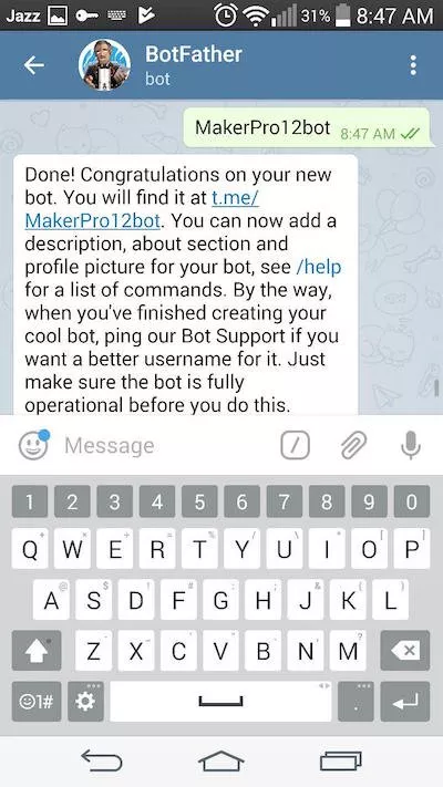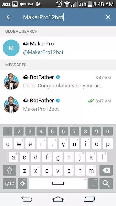 Затем найдите созданного бота через поиск, чтобы убедиться в его успешном создании.