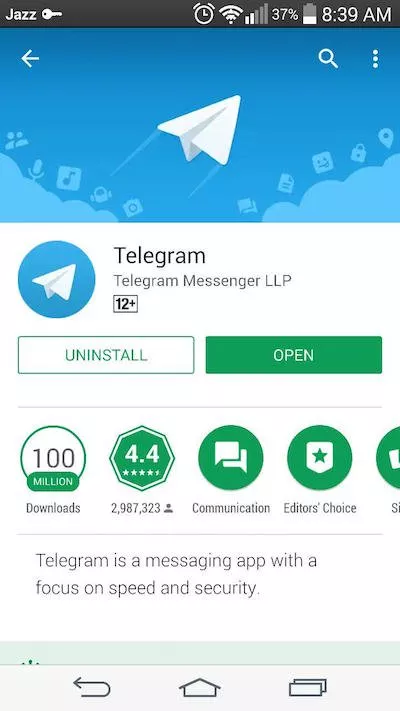 Для начала откройте Google Play и скачайте приложение Telegram.