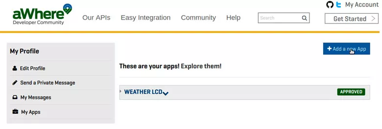 Бесплатную учётную запись можно зарегистрировать на сайте aWhere здесь. После регистрации откройте «Моя учетная запись» (англ. - My Account) в правом верхнем углу и перейдите в раздел «Мои приложения» (англ. - My apps). Там нажмите синюю кнопку «Добавить новое приложение» (англ. - Add a new App), как показано на рисунке: