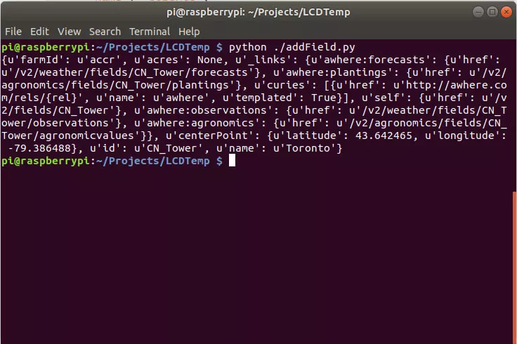 Складывается впечатление, что сервис aWhere ориентирован преимущественно на агропромышленную сферу, поэтому для указания местоположения и получения температурных данных необходимо «добавить поле» (англ. - add a field) в своё приложение.