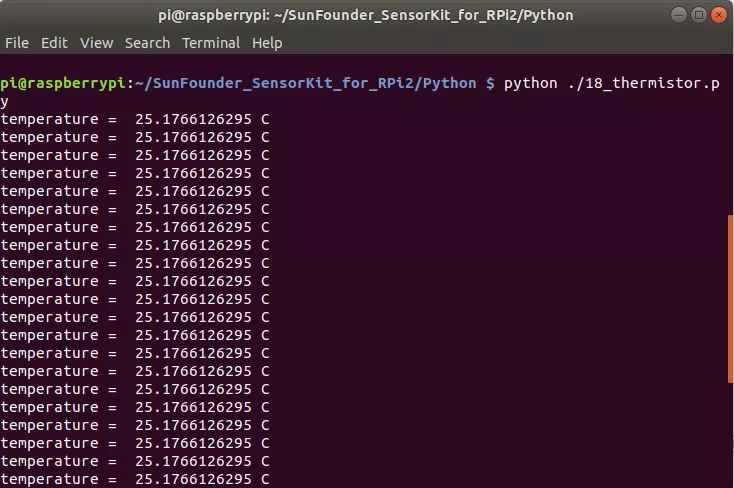 Для проверки схемы запустите файл «18_thermistor.py». Вывод должен быть приблизительно таким.