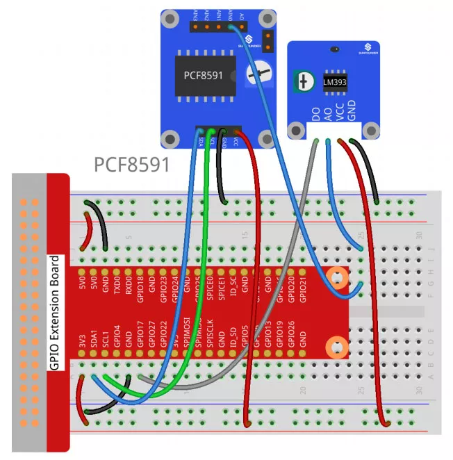 В данном уроке задействован Sensor Kit V2.0 от SunFounder, включающий аналоговый температурный сенсор и модуль PCF8591 — устройство для сбора аналоговых данных. За основу взята схема подключения от SunFounder, представленная ниже: