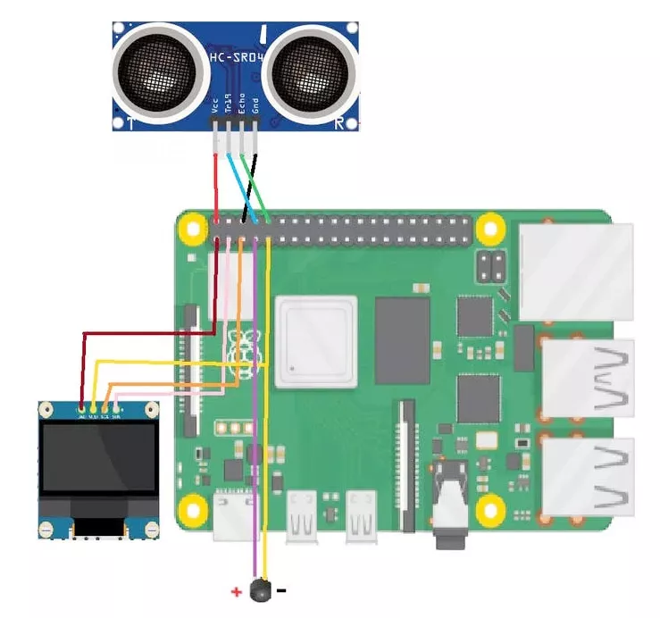Рассмотрим, как подключить ультразвуковой датчик, OLED-дисплей и зуммер к Raspberry Pi.