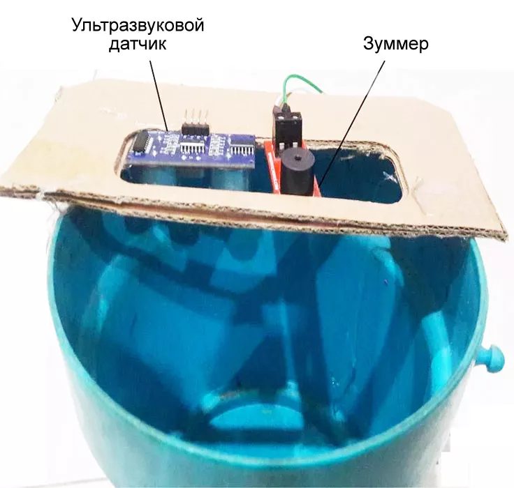 Закрепите опору на ведре. После этого установите на ней зуммер и ультразвуковой датчик.