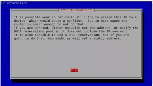 Затем появится предупреждение о том, что маршрутизатор может назначить данный IP-адрес другим устройствам, вызвав конфликт. Проигнорируйте это уведомление и нажмите Enter.